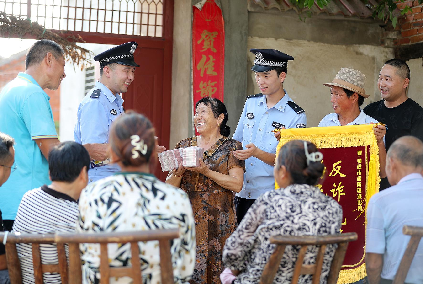 图为8月22日,钟祥市公安局胡集派出所民警在胡集镇丽阳村,上门退还电信诈骗受害人20万元被骗款,并陪同受害人“现身说法”,向村民讲述被骗经历,让村民识破电信诈骗伎俩,远离电信诈骗。