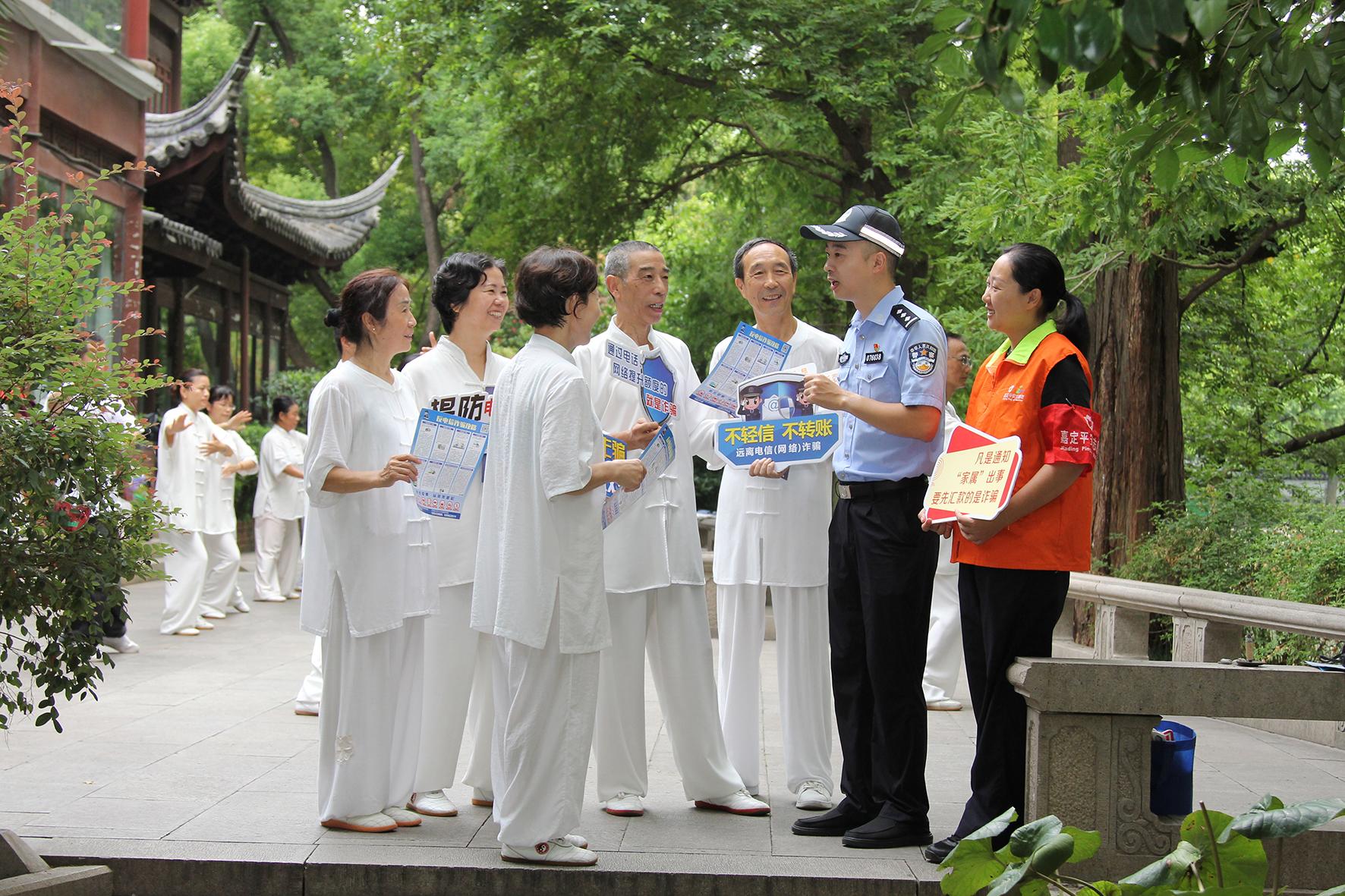 8月27日清晨,上海市公安局嘉定分局嘉城派出所民警与平安志愿者在辖区汇龙潭公园,向参加太极拳友会的中老年晨练者讲解反诈知识。