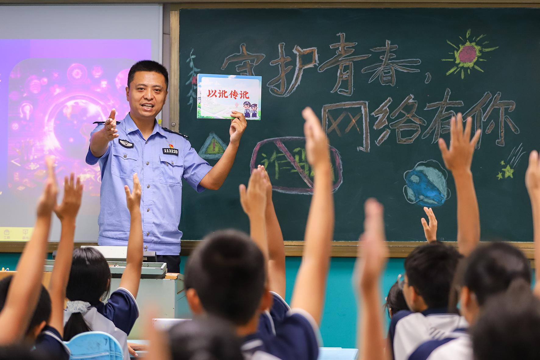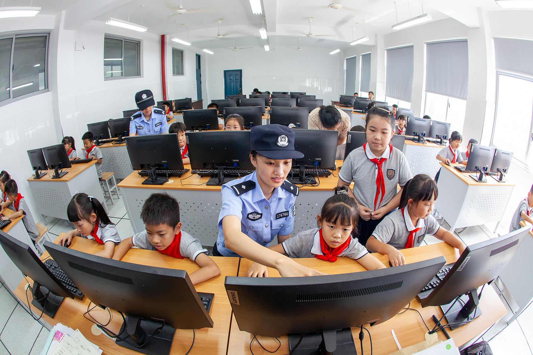 9月9日,浙江省台州市公安局黄岩分局新前派出所民警来到辖区的小学,给正在电脑教室上课的学生们讲解网络安全理念和相关法律知识。