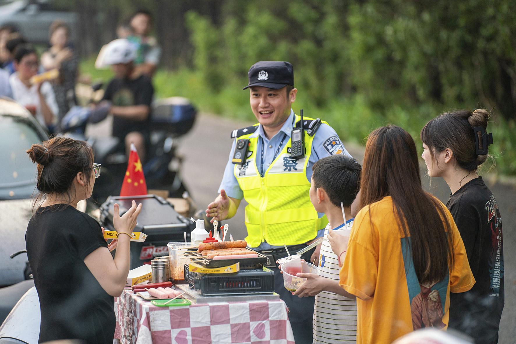 图为民警在环岛江堤对商户开展安全提示。