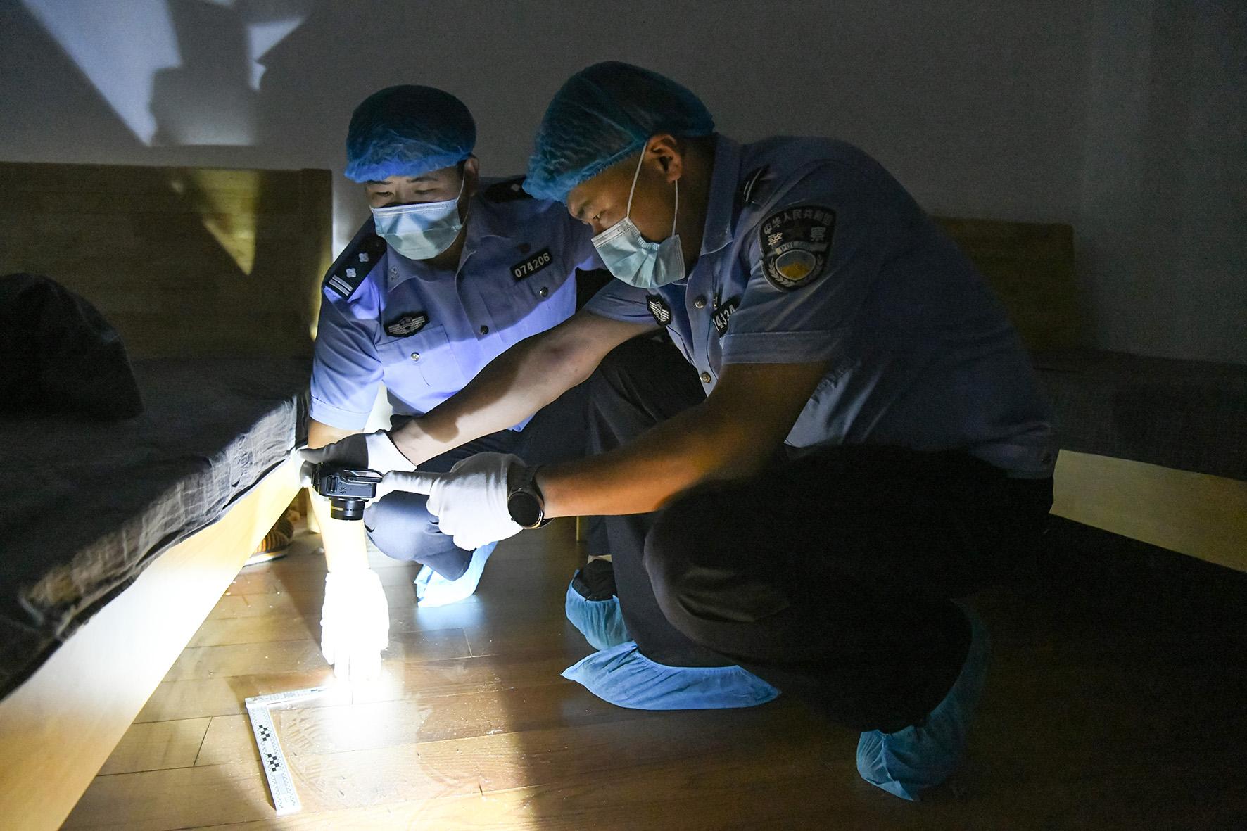 图为刑事技术民警分析提取入室盗窃犯罪现场足迹。