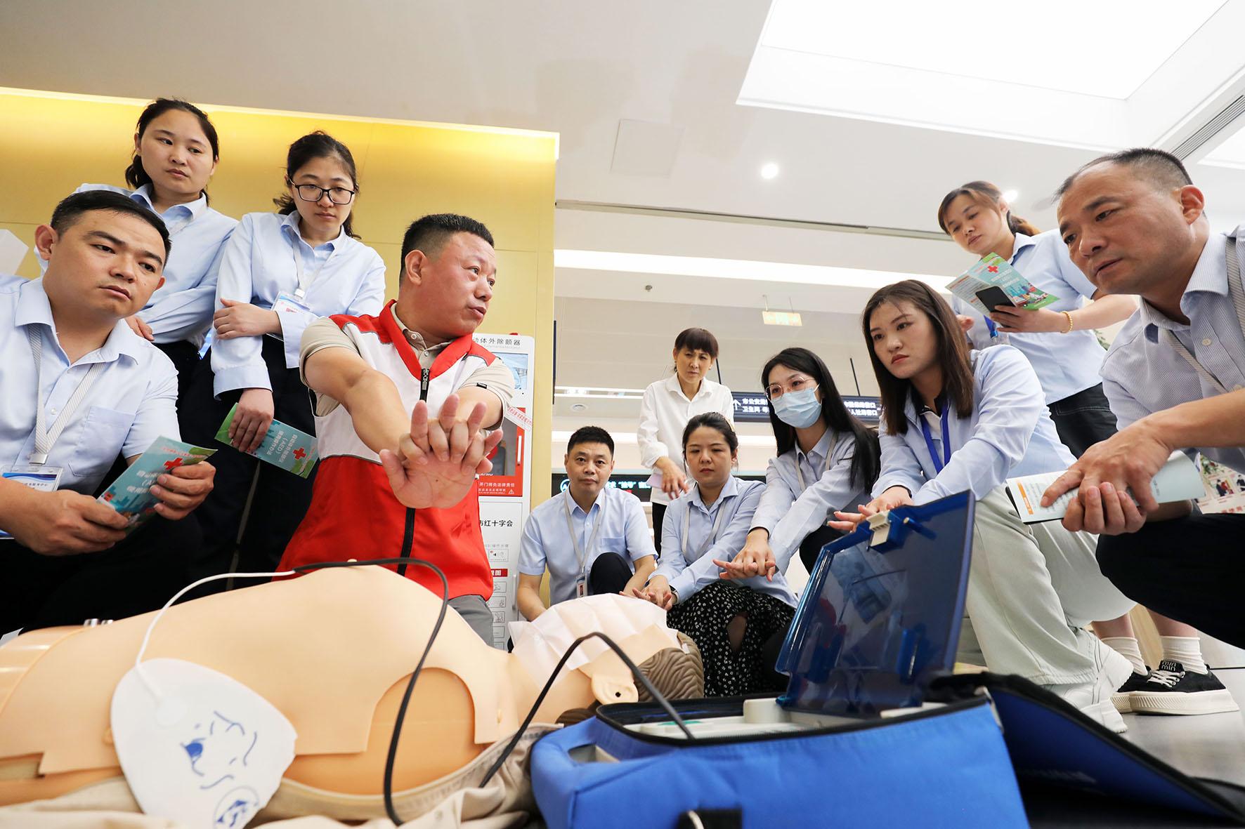 9月14日,是“世界急救日”。在安徽省淮北市政务服务中心,淮北市红十字会志愿者向工作人员讲解如何使用AED(自动体外除颤器)和演示急救设备的操作方法。