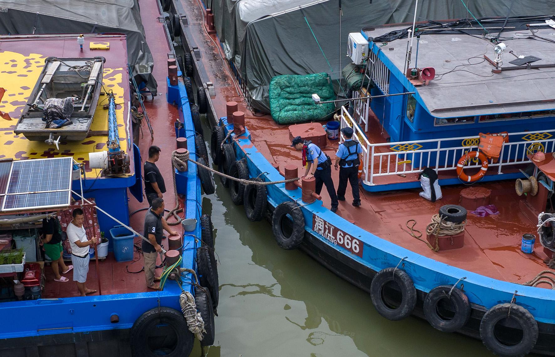 9月20日,长江航运公安局镇江分局镇江派出所水上巡逻队民警在江苏省镇江市大港码头港池内开展安全隐患排查,以应对台风“普拉桑”再次来袭。
