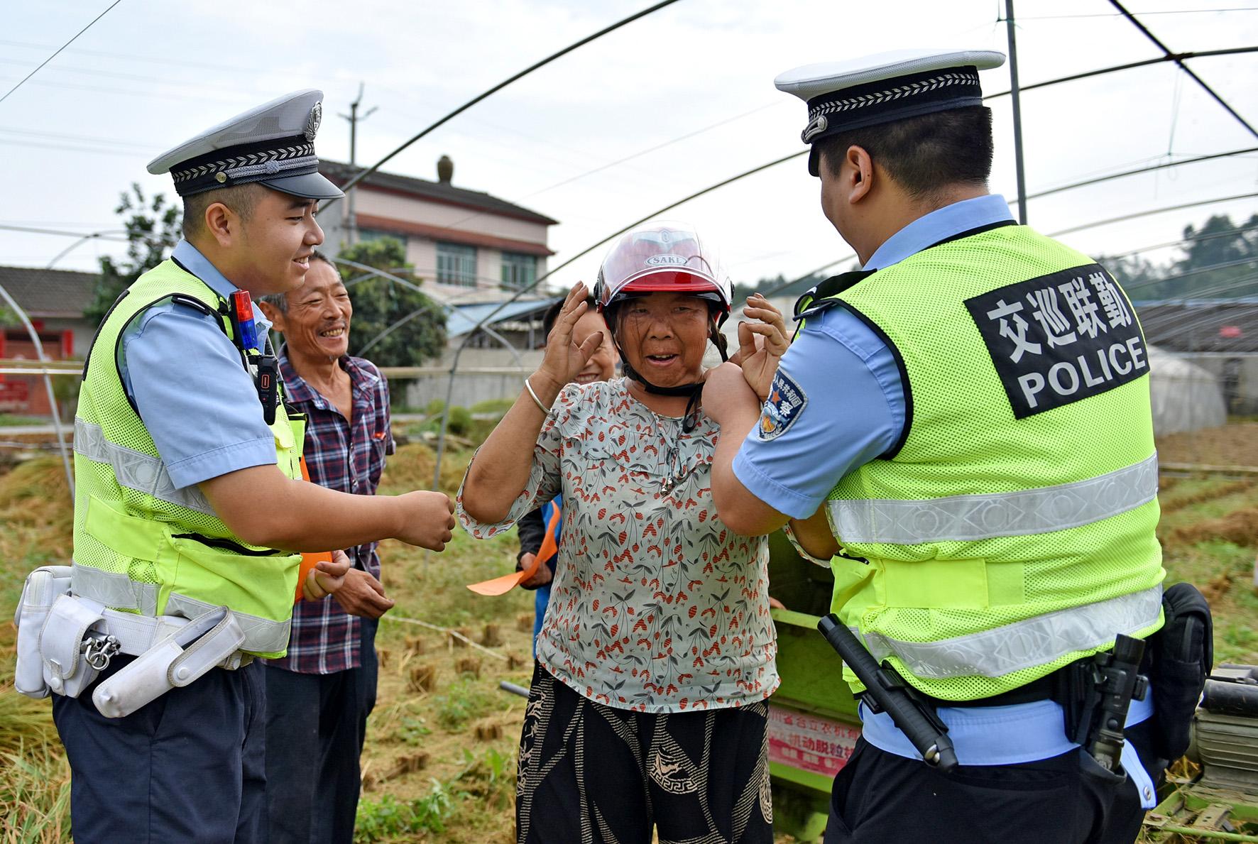 9月24日,四川省绵阳市公安局交警支队直属二大队民辅警来到田间地头,向村民讲解驾乘摩托不佩戴安全头盔、超员等交通违法行为的危害,进一步增强村民的守法和交通安全意识。
