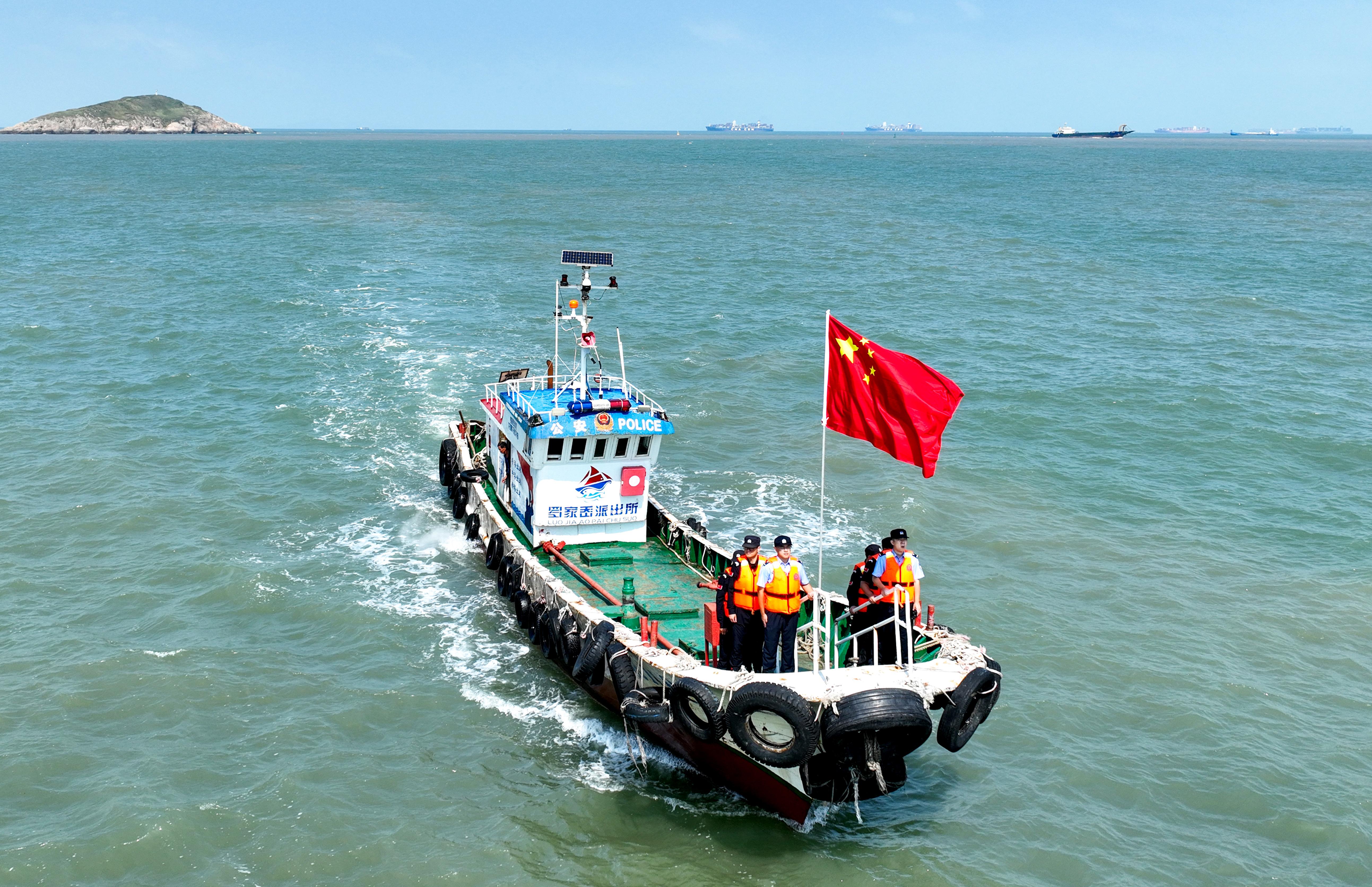 10月1日,浙江省舟山市岱山县公安局罗家岙派出所民警辅警坚守岗位,乘坐“红帆110”船只开展“祝福祖国 守护平安”主题海上巡查行动。