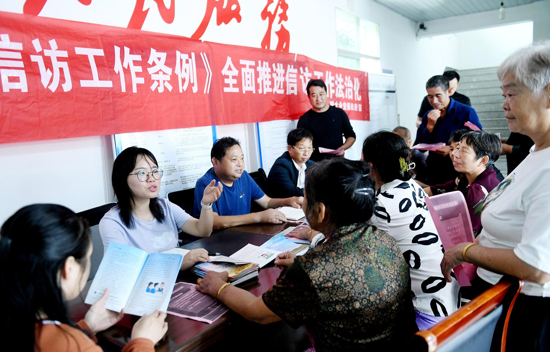 10月11日,江西省德兴市昄大乡信访干部在定坑村宣讲《信访工作条例》,引导村民依法信访。