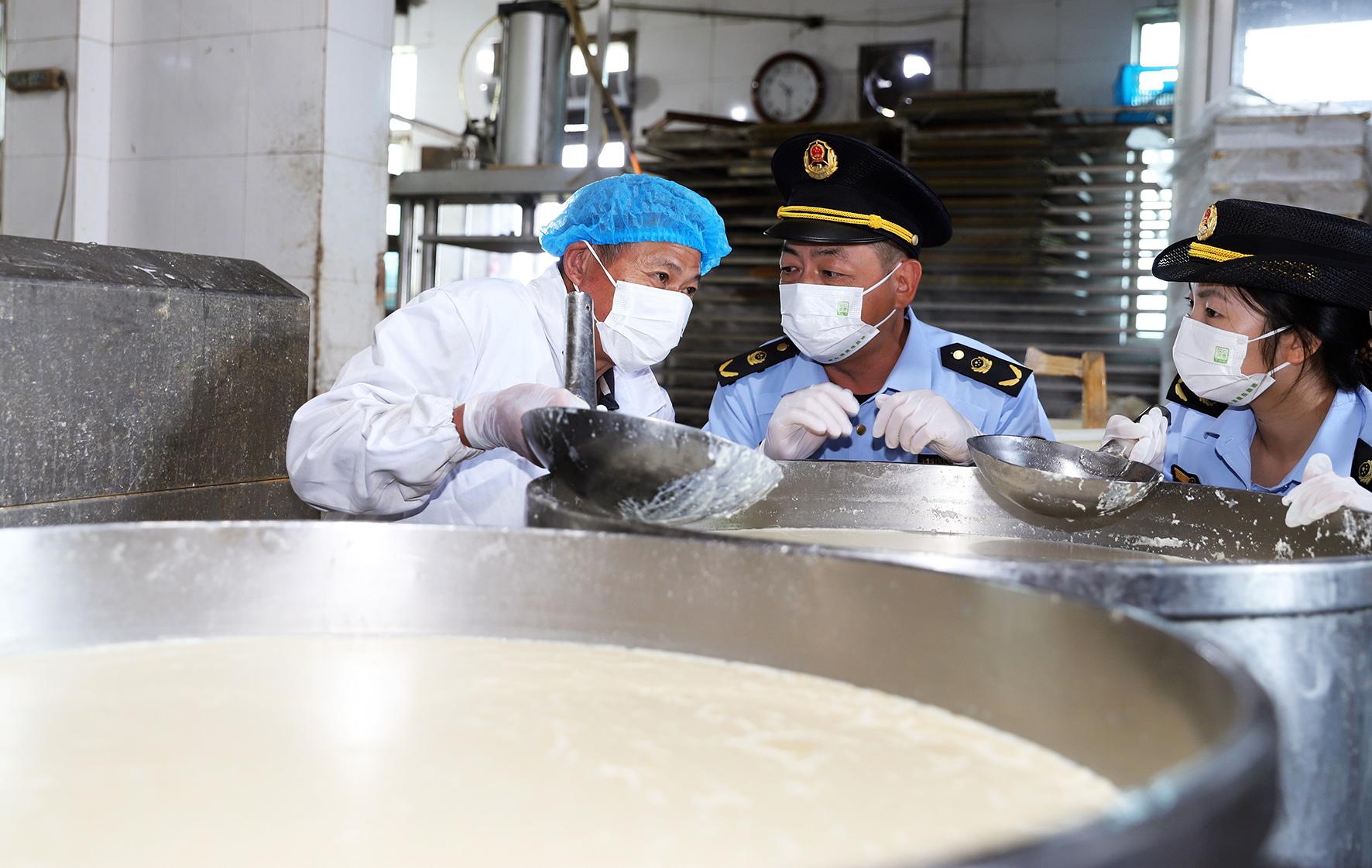 10月23日,浙江省台州市路桥区横街镇市场监督管理所执法人员在一家豆腐生产作坊检查食品安全,向从业人员宣传食品安全的相关法律法规。