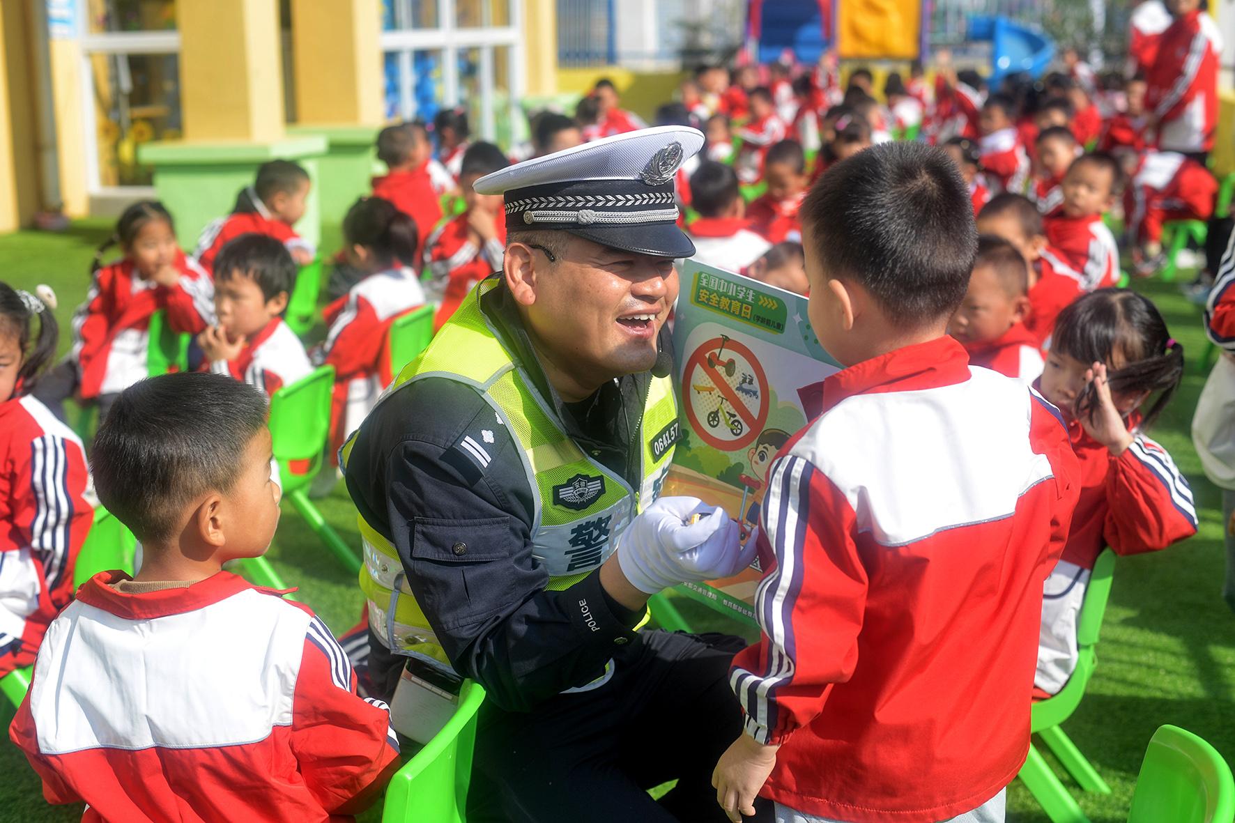 10月23日,安徽省巢湖市公安局交警大队民警结合宣传图板,向幼儿园小朋友们讲解道路交通安全知识。