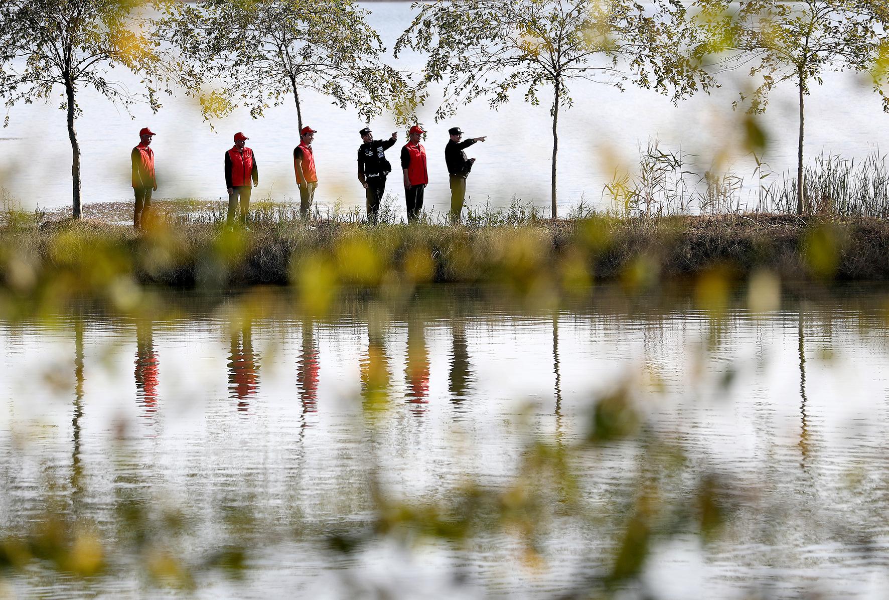 10月23日,湖北省沙洋县公安局纪山派出所民警和四方社区巡防队员,在沙洋县纪山镇钱家湾水库开展联勤巡逻。