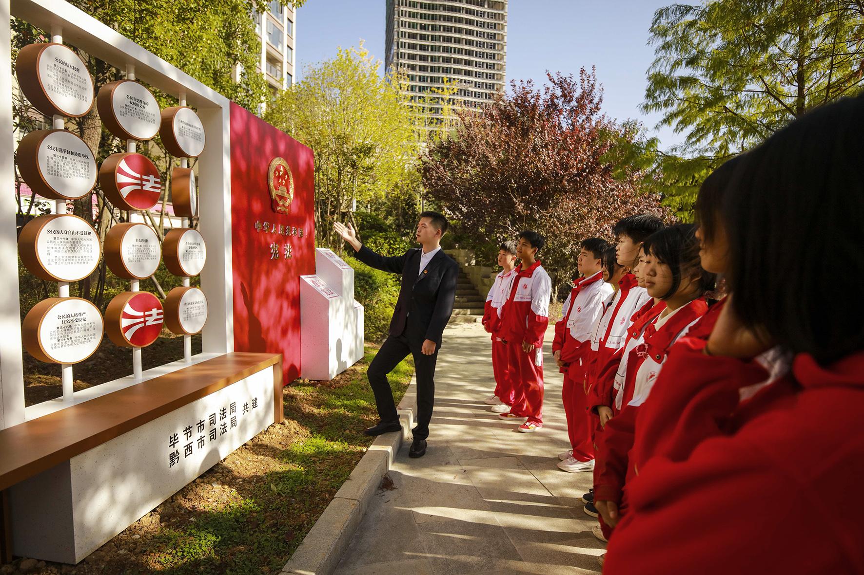 10月23日,贵州省黔西市第二中学的学生走进莲城街杜鹃湖法治公园,开展沉浸式学习法治知识。
