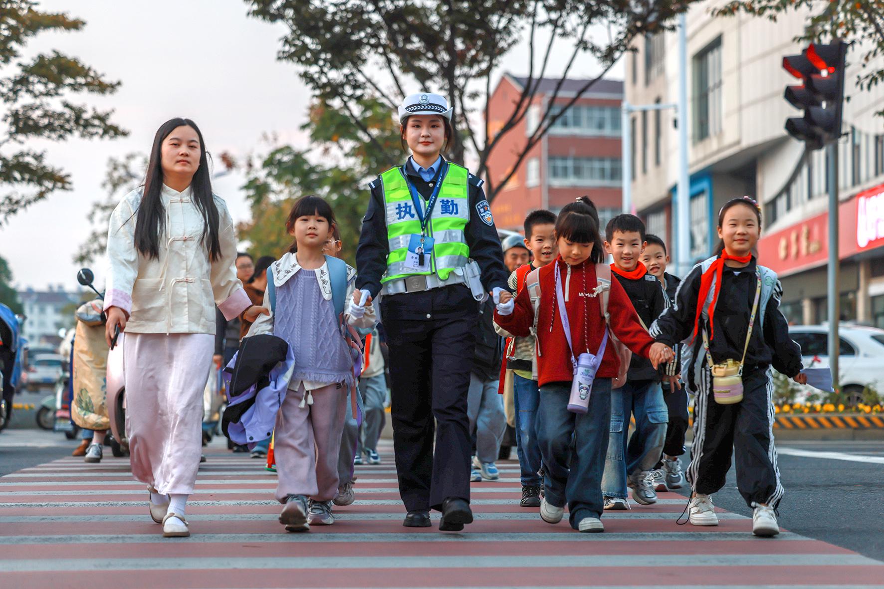 10月29日,安徽省广德市公安局交警大队民警在第四小学周边开展护学工作。