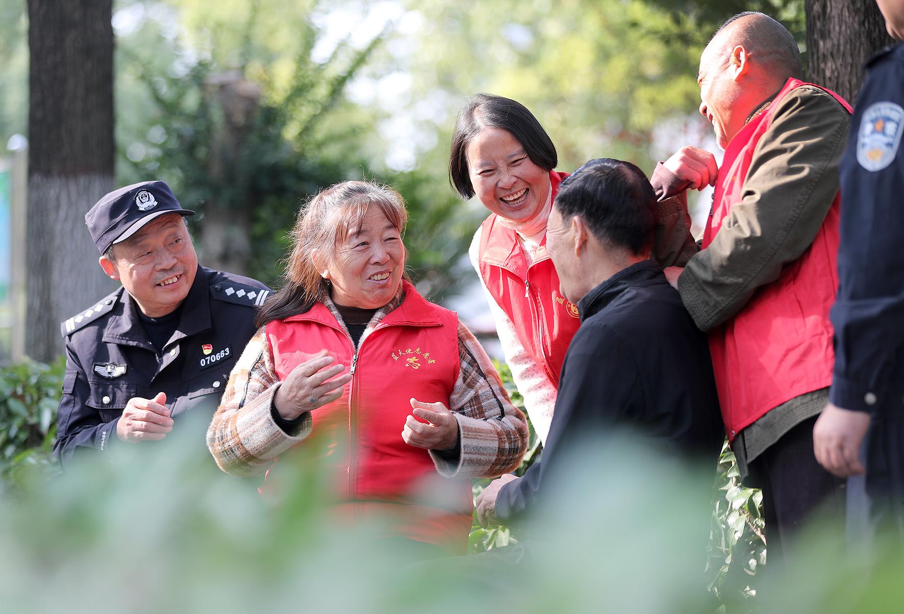 图为11月5日,民警与救助对象一起在公园向老年人开展防范养老诈骗普法宣传活动。
