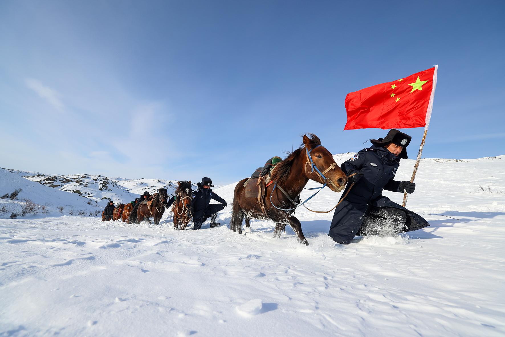 11月18日,新疆出入境边防检查总站阿勒泰边境管理支队加郎阿什边境派出所民辅警前往边境一线开展踏雪巡边。