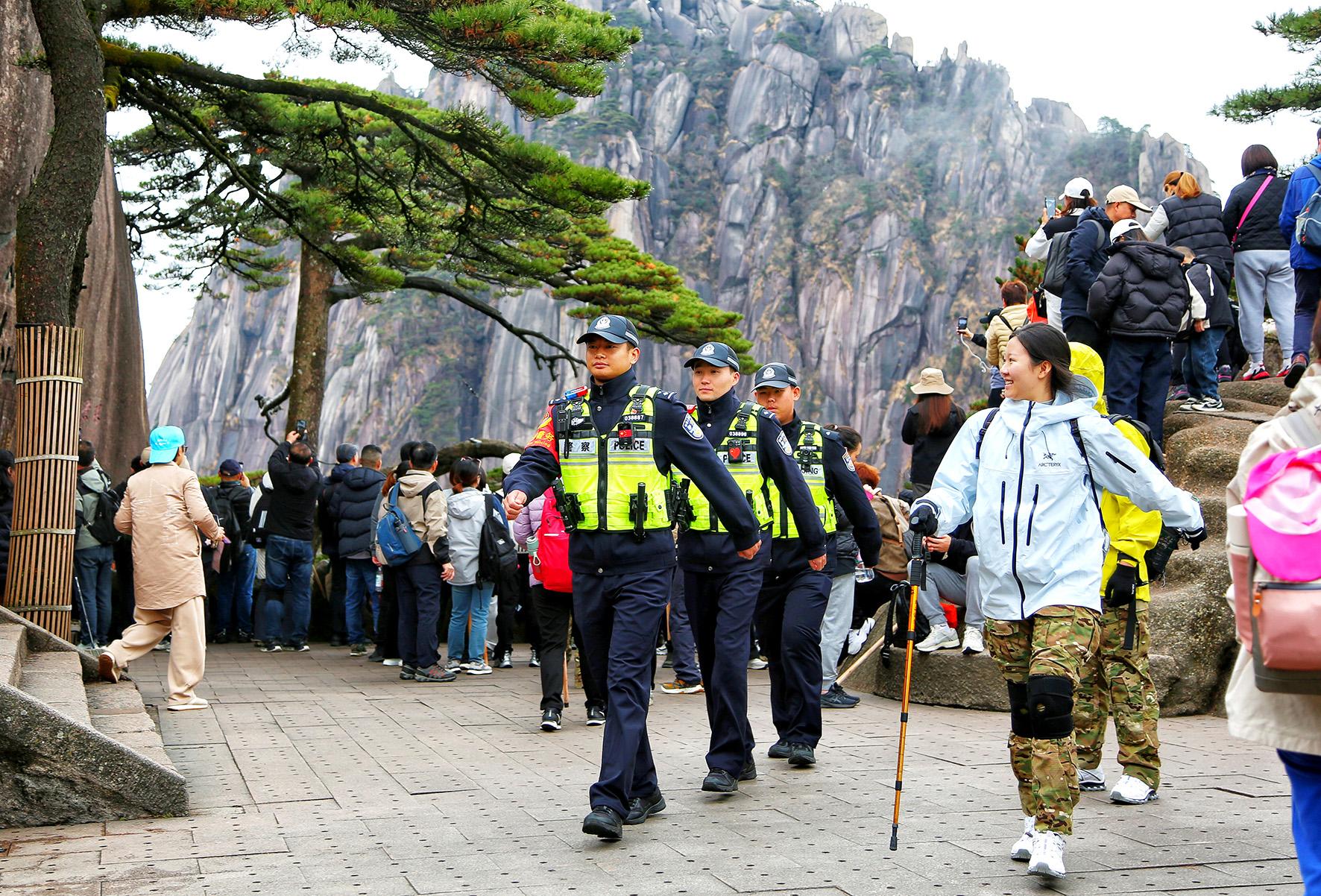 11月19日,安徽省黄山风景区公安局玉屏楼派出所执勤民警辅警在秀美风景中执勤,也成为游客眼中的一道亮丽风“警”线。