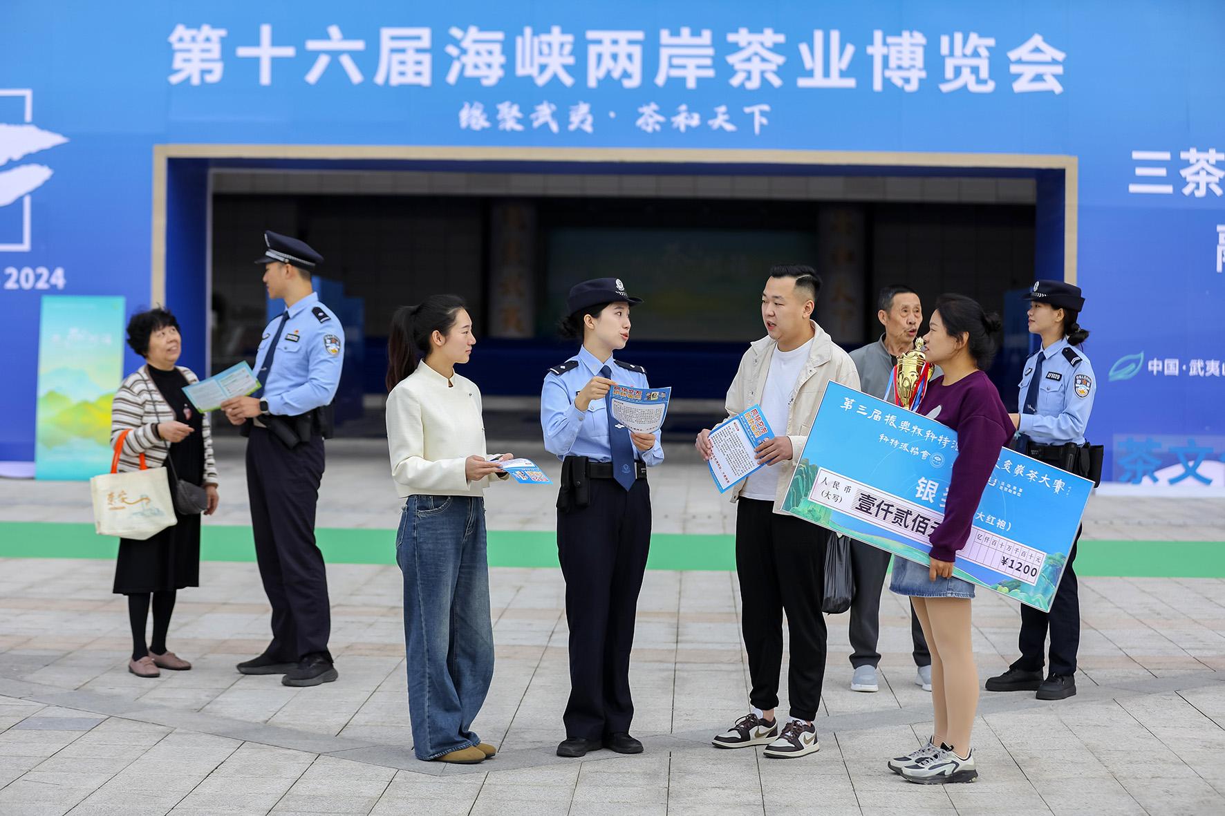 11月19日,福建省武夷山市公安局新丰派出所民警正在给参加茶业博览会的客商介绍反诈知识。