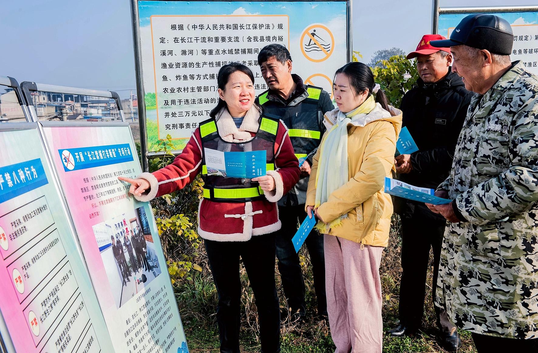 12月12日,安徽省含山县仙踪镇禁渔办在滁河沿岸开展禁捕行动,通过展板展示、资料发放、现场讲解等形式,向周边村民宣传禁捕知识。