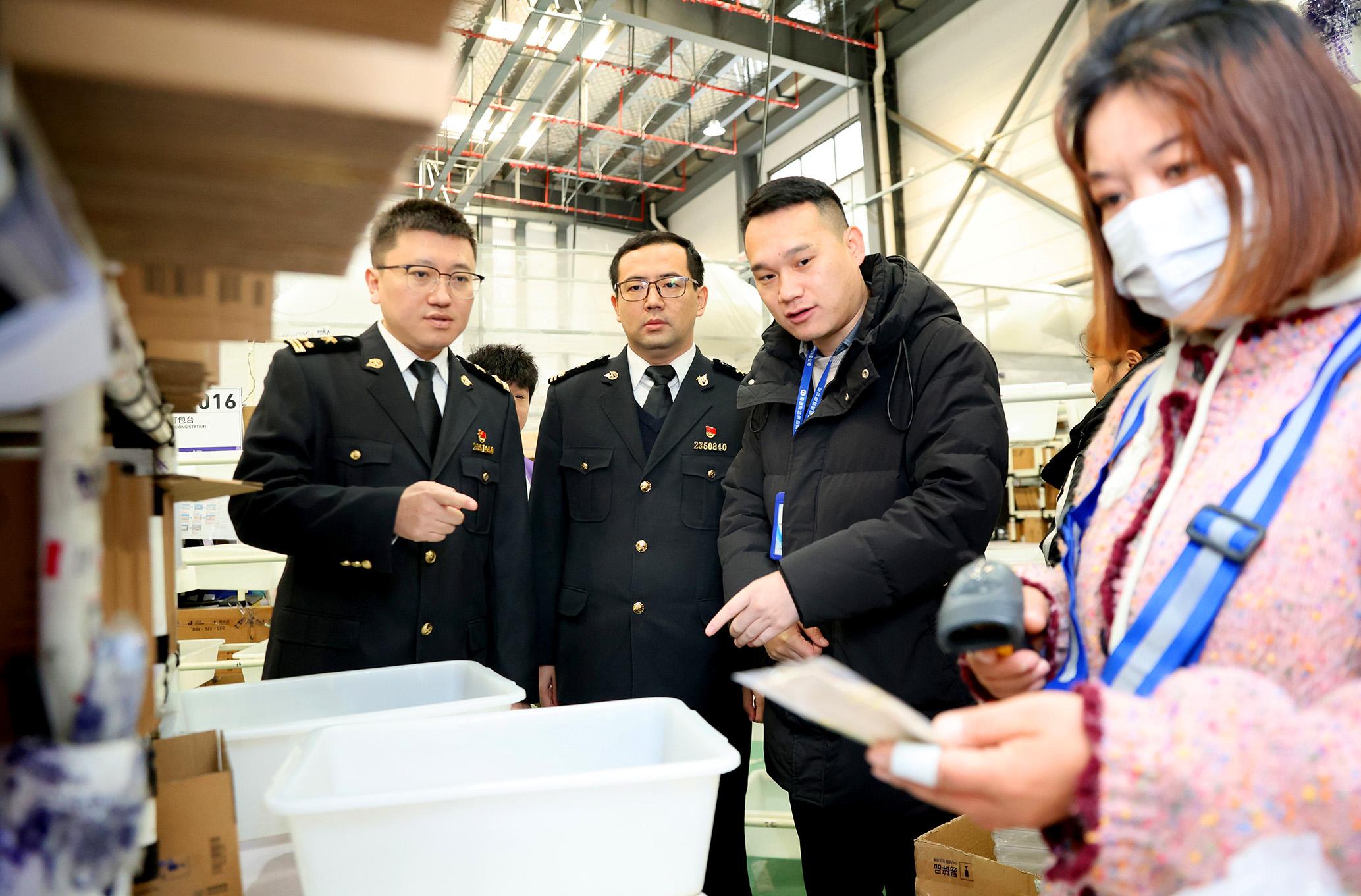 12月12日,在江苏南通综合保税区灿达公司跨境仓库,海关关员现场查看准备打包发运的包裹。