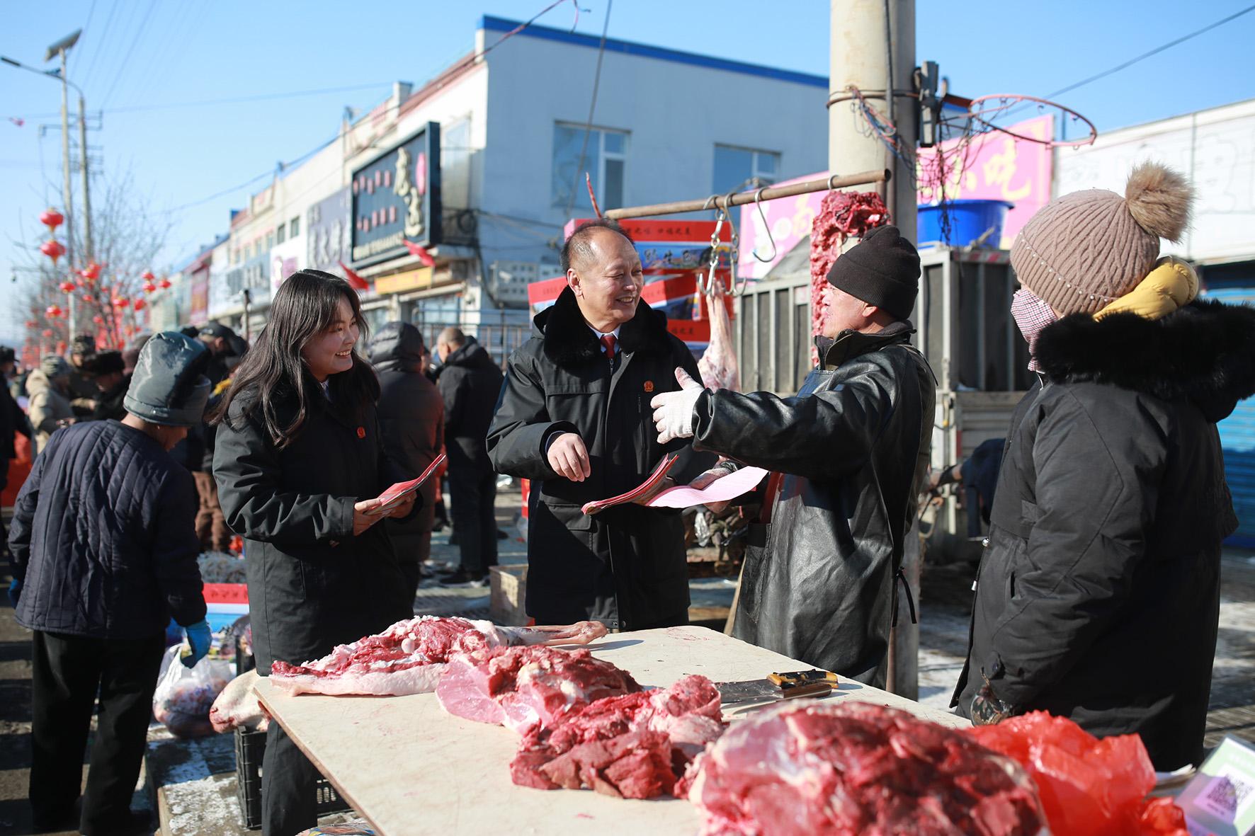 1月14日,吉林省伊通满族自治县人民法院营城子法庭法官走进集市,宣讲消费者权益保护法等法律法规。