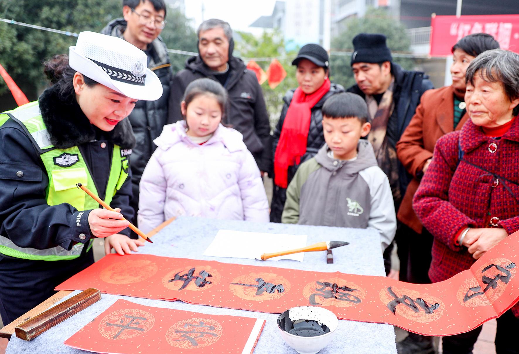 1月15日,四川省华蓥市公安局交通警察大队的书法爱好者,在永兴镇马架坪村文体广场,为群众书写“平安春联”。