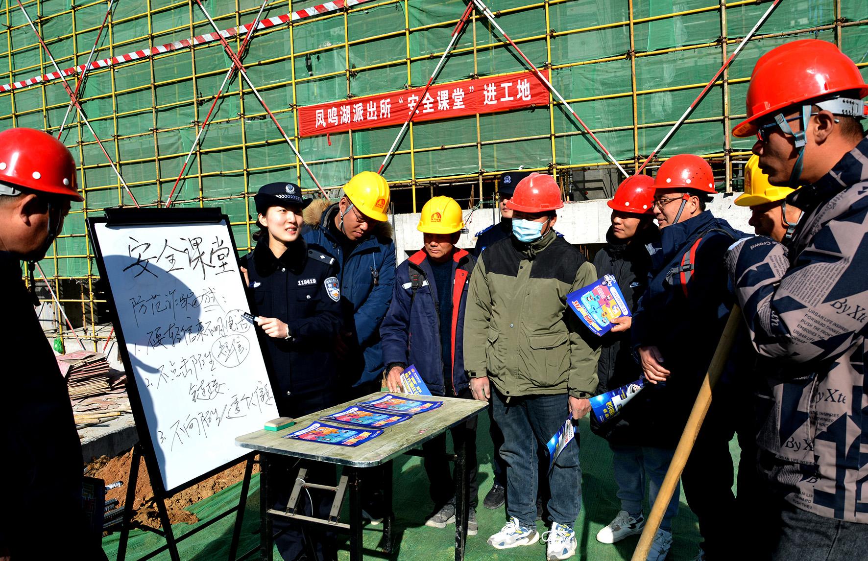 1月17日,山东省枣庄市公安局薛城分局凤鸣湖派出所组织民警辅警走进辖区建筑工地,通过开设工地安全课堂,向务工人员宣传反诈、防盗知识。