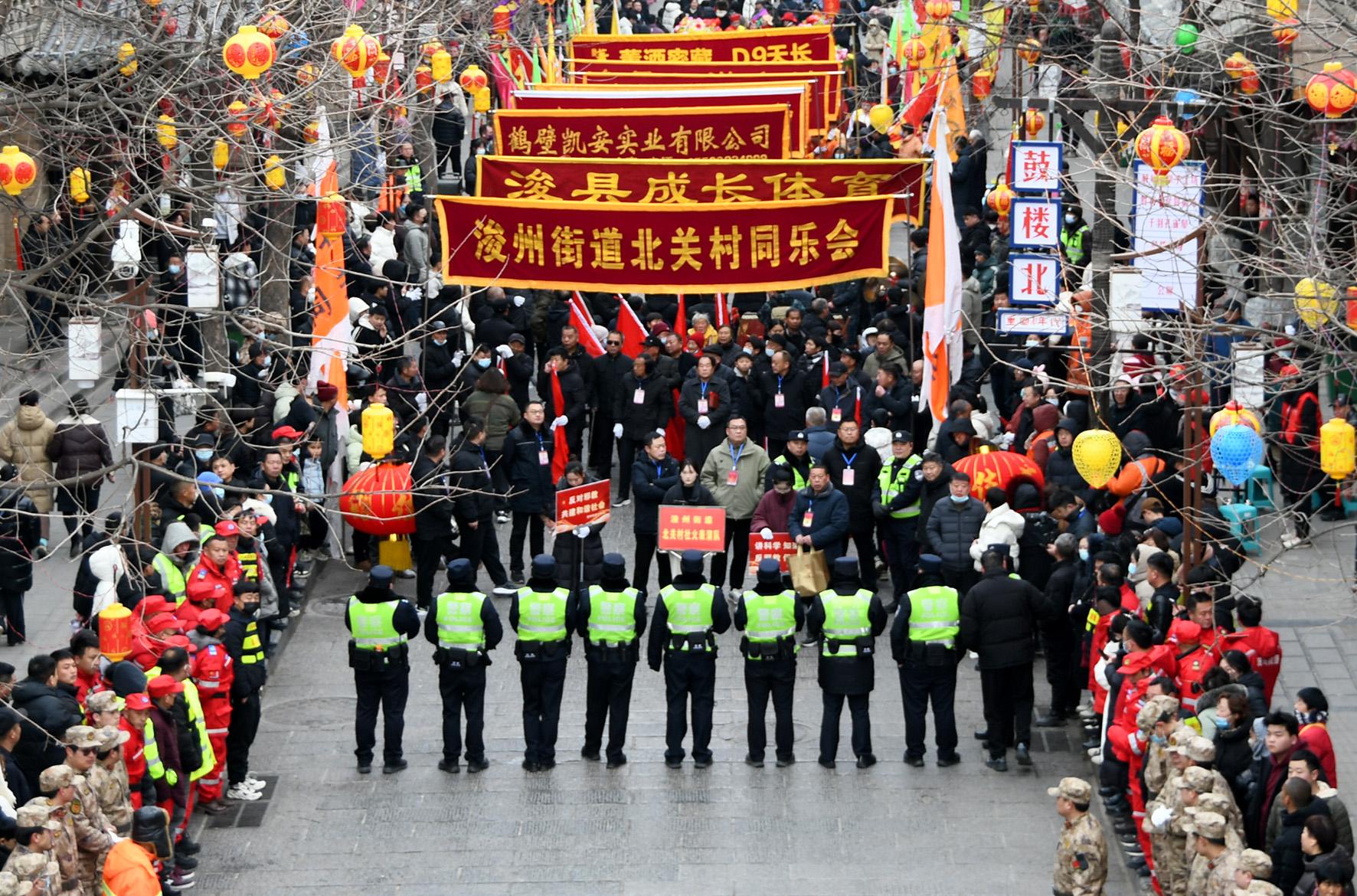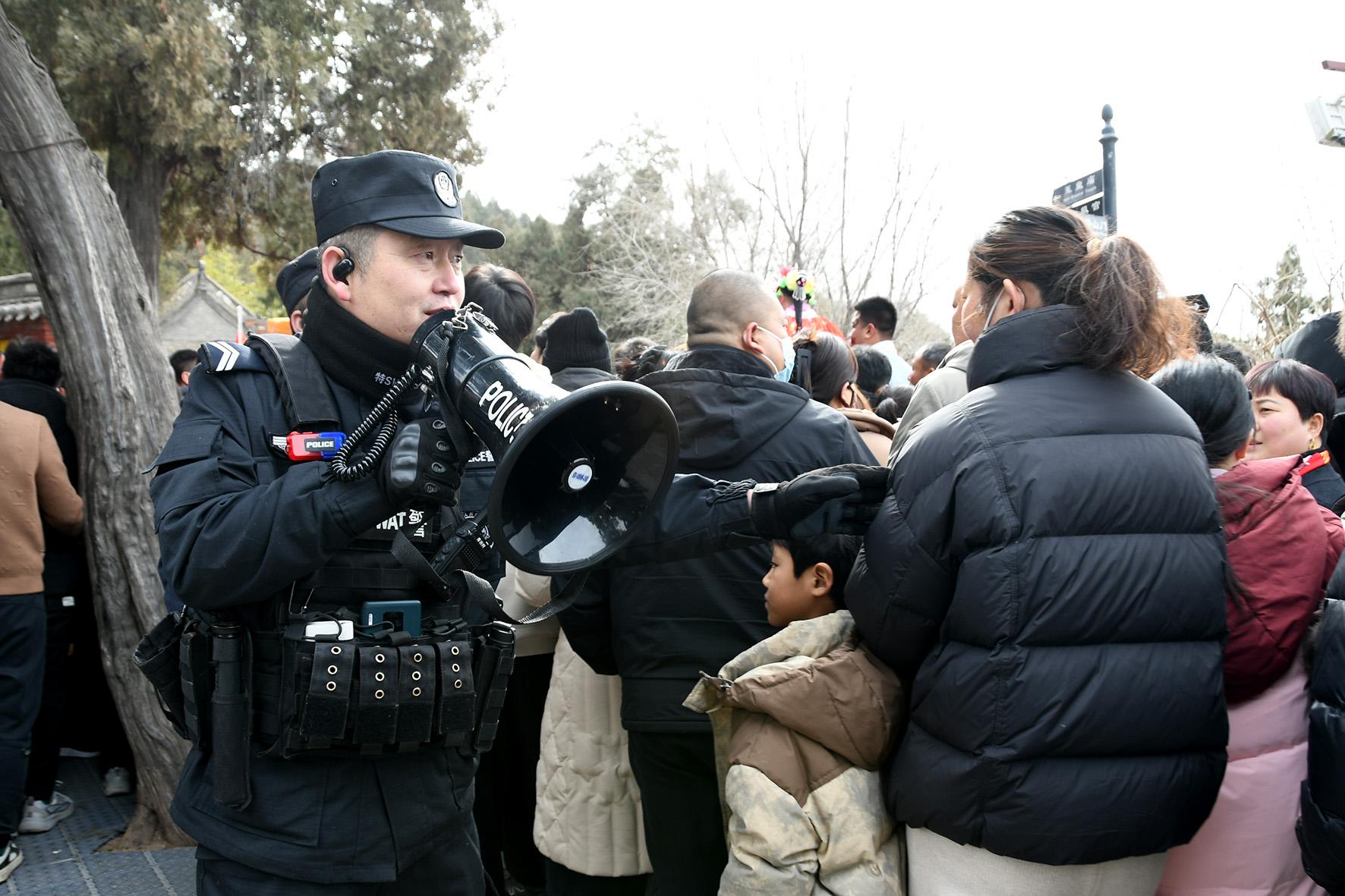 2月6日,河南省浚县公安局民警辅警在正月古庙会现场执勤。