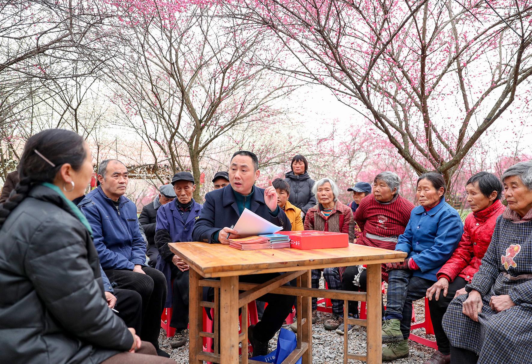 2月11日,四川省华蓥市禄市镇凉水井村的法律顾问在村头的生态园组织业主和务工村民学习相关法律知识。