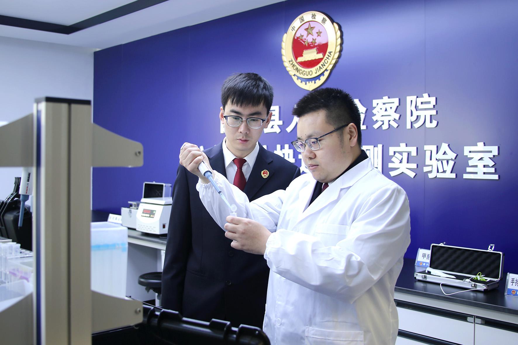 图为办案干警在公益诉讼快检室对提取的污染物进行检测。