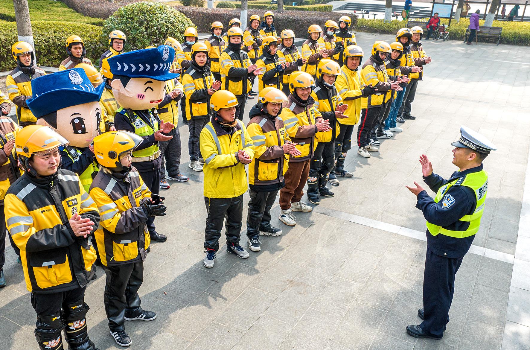 2月26日,上海市公安局崇明分局交警支队民警来到辖区南门广场向外卖骑手开展交通安全宣传。