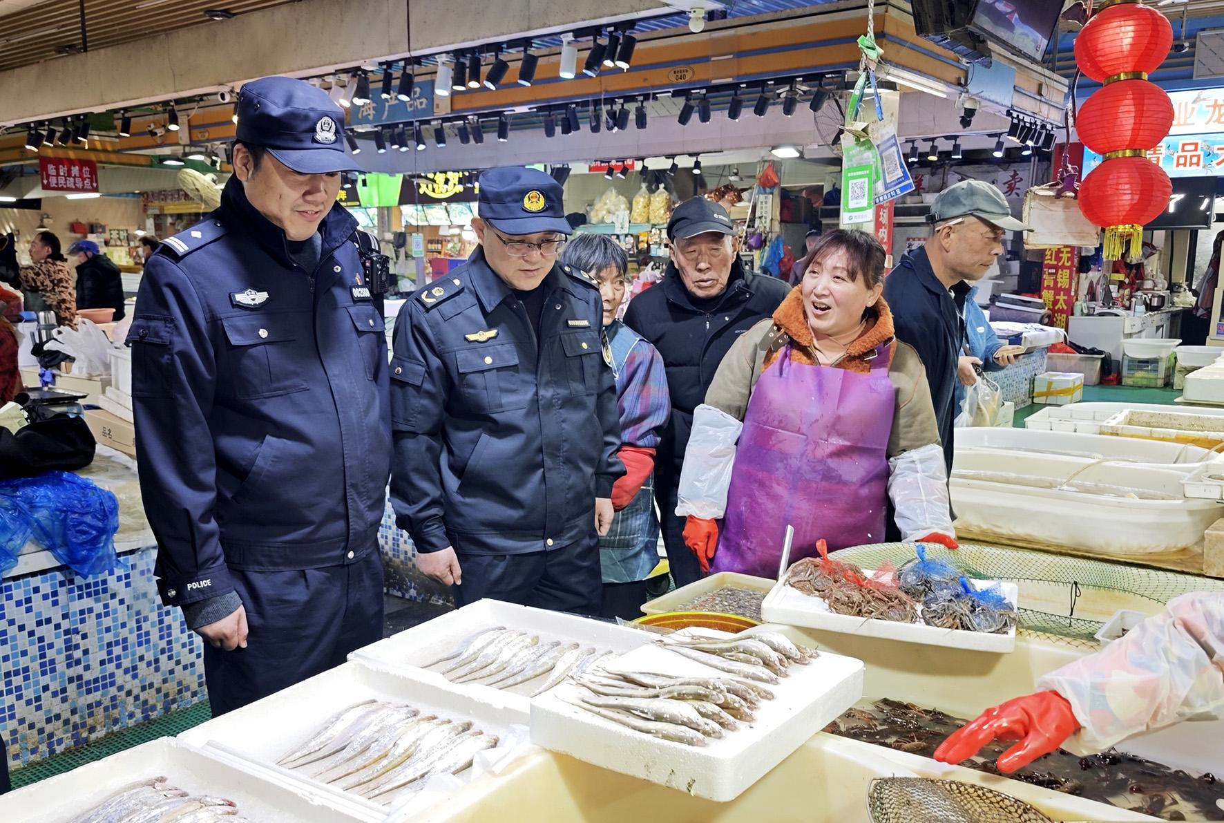 图为联合执法人员检查市场销售刀鱼情况。