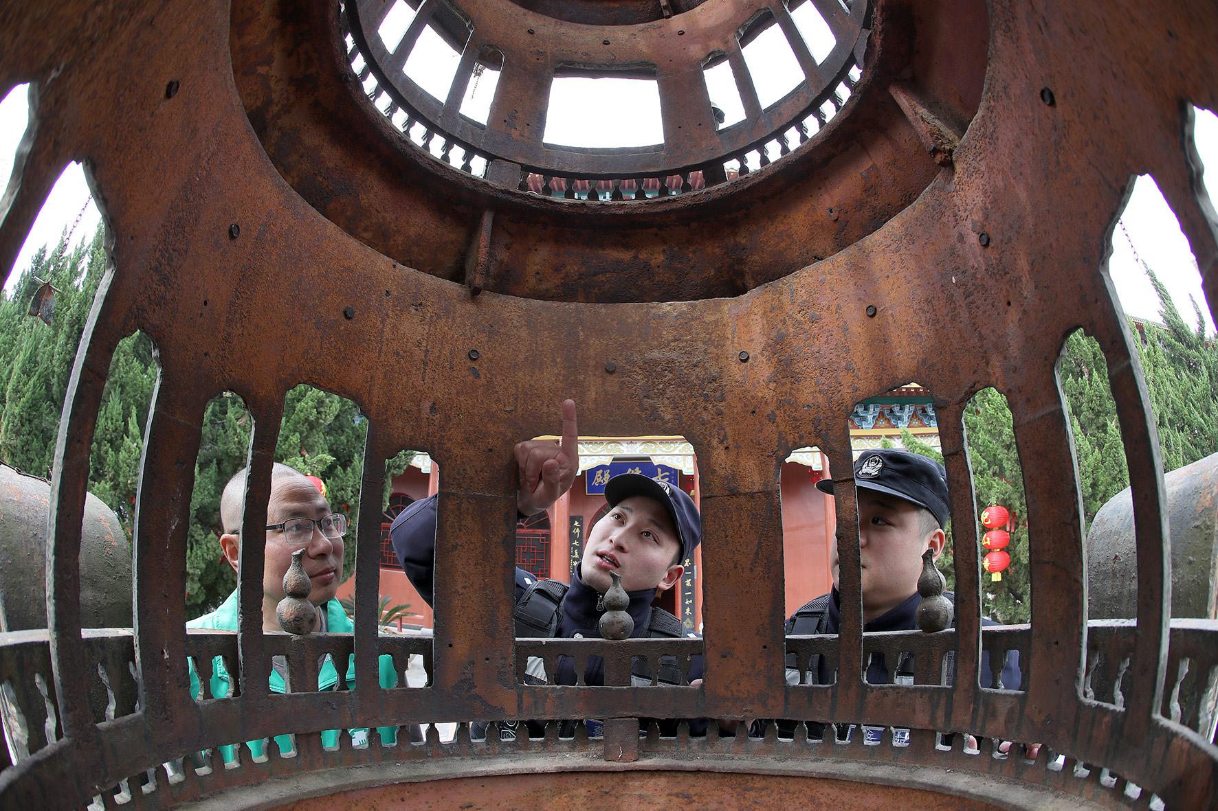 图为3月17日,荆门市博物馆工作人员与沙洋县公安局纪山派出所民警,对始建于隋朝的纪山寺开展系统性安全隐患排查。