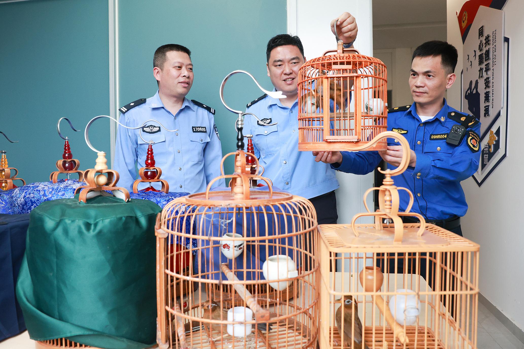 图为民警和林业执法人员对查获画眉鸟进行鉴定。