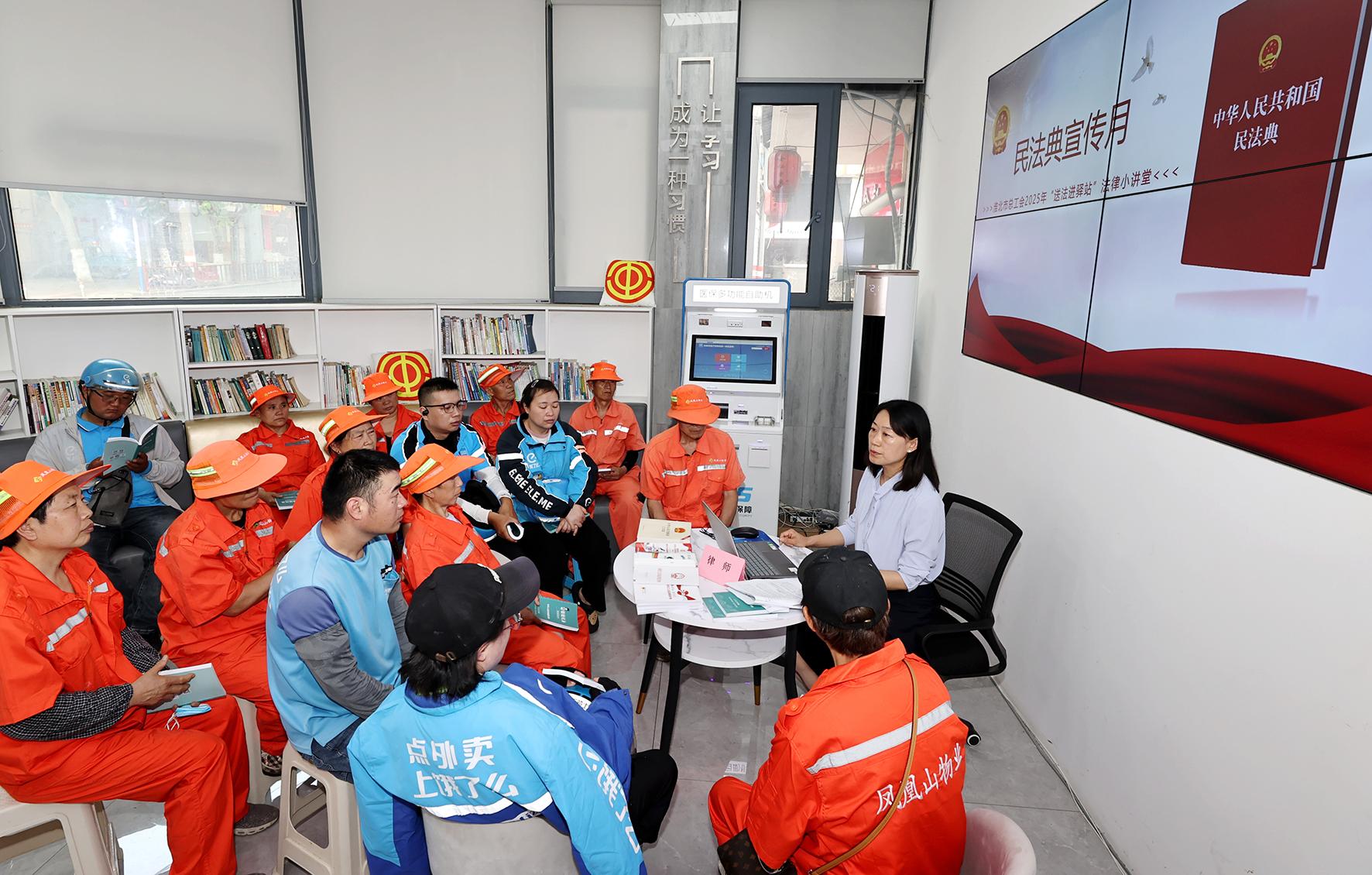 5月22日,安徽省淮北市总工会邀请专职律师走进工会驿站,以案说“法”、以案释“典”,帮助快递外卖员、物业管理员等新业态劳动者提升依法维护自身合法权益的意识和能力。