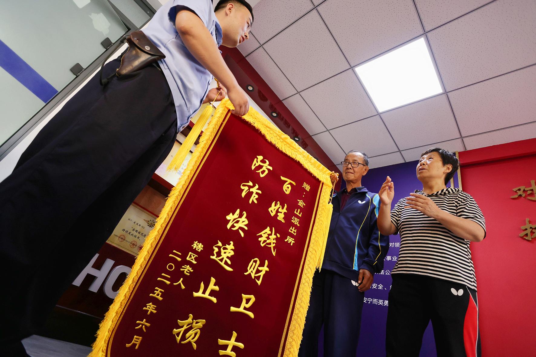 6月16日,一对老年夫妻来到辽宁省本溪市公安局明山分局金山派出所,将精心制作的锦旗送到民警手中,感谢民警及时帮助老人识破骗局,保住了养老救命钱。