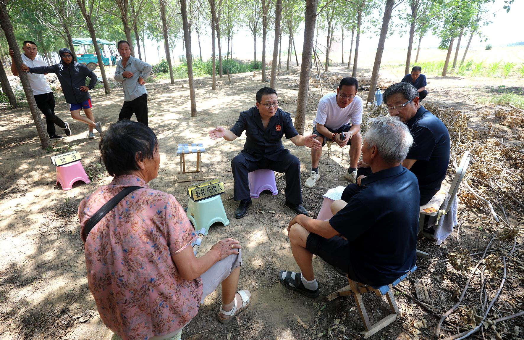6月17日上午,河南省安阳县人民法院组织法官深入辖区高庄镇田间地头巡回审理一起土地承包经营权纠纷案。其间,法官对土地现状进行了实地勘验,现场开庭审理,就地组织调解,以优质高效的司法服务把纠纷解决在群众“家门口”。