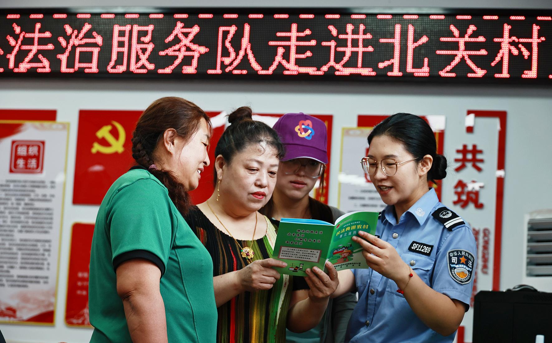 图为法治服务队队员在龙兴镇北关村为群众解读法律问题。