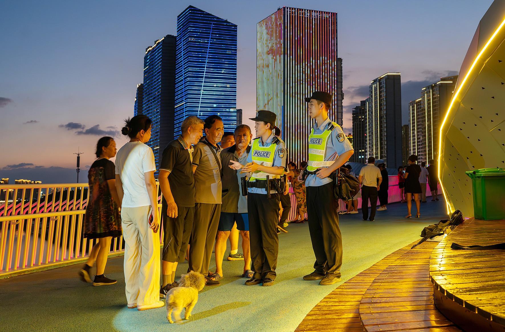 图为7月3日晚,民警在永宁江景观桥巡逻,并向群众宣传夏季安全防护知识。