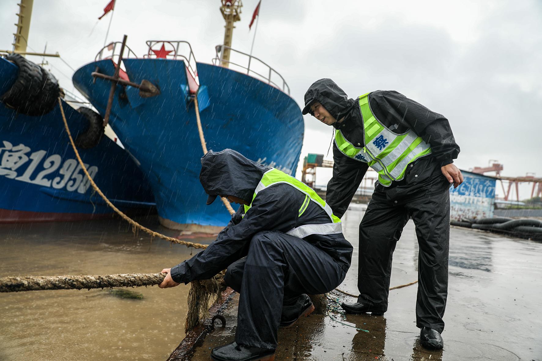 7月8日,今年第4号台风“丹娜丝”逼近浙江沿海,浙江省台州市公安局椒江分局前所派出所民警辅警深入码头开展抗台风工作。
