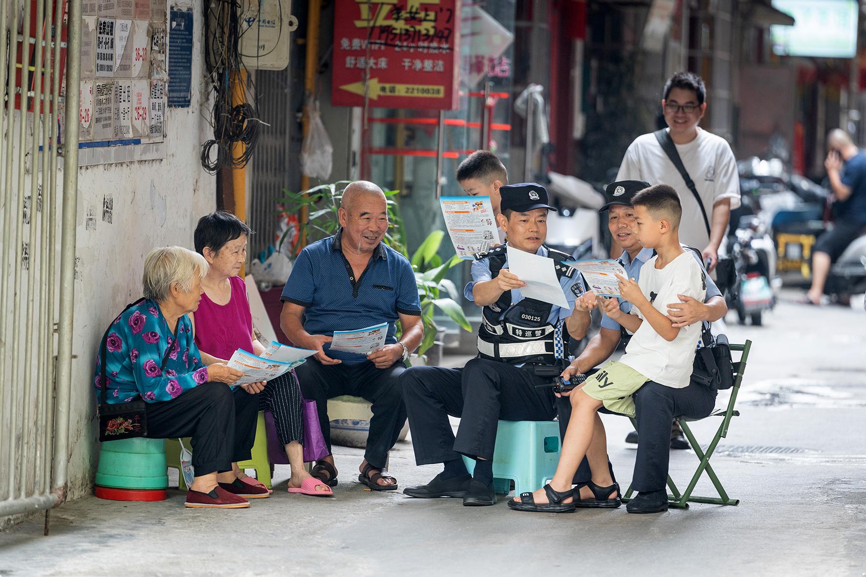 图为7月16日,特巡警支队巡逻一大队的民警在涪城区南河五六社区向居民宣讲反诈知识。