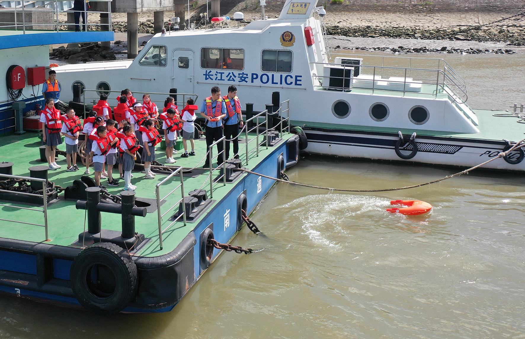 7月23日,长江航运公安局南通分局通州派出所民警在水上执法基地为爱心暑托班的孩子们宣讲防溺水安全知识。