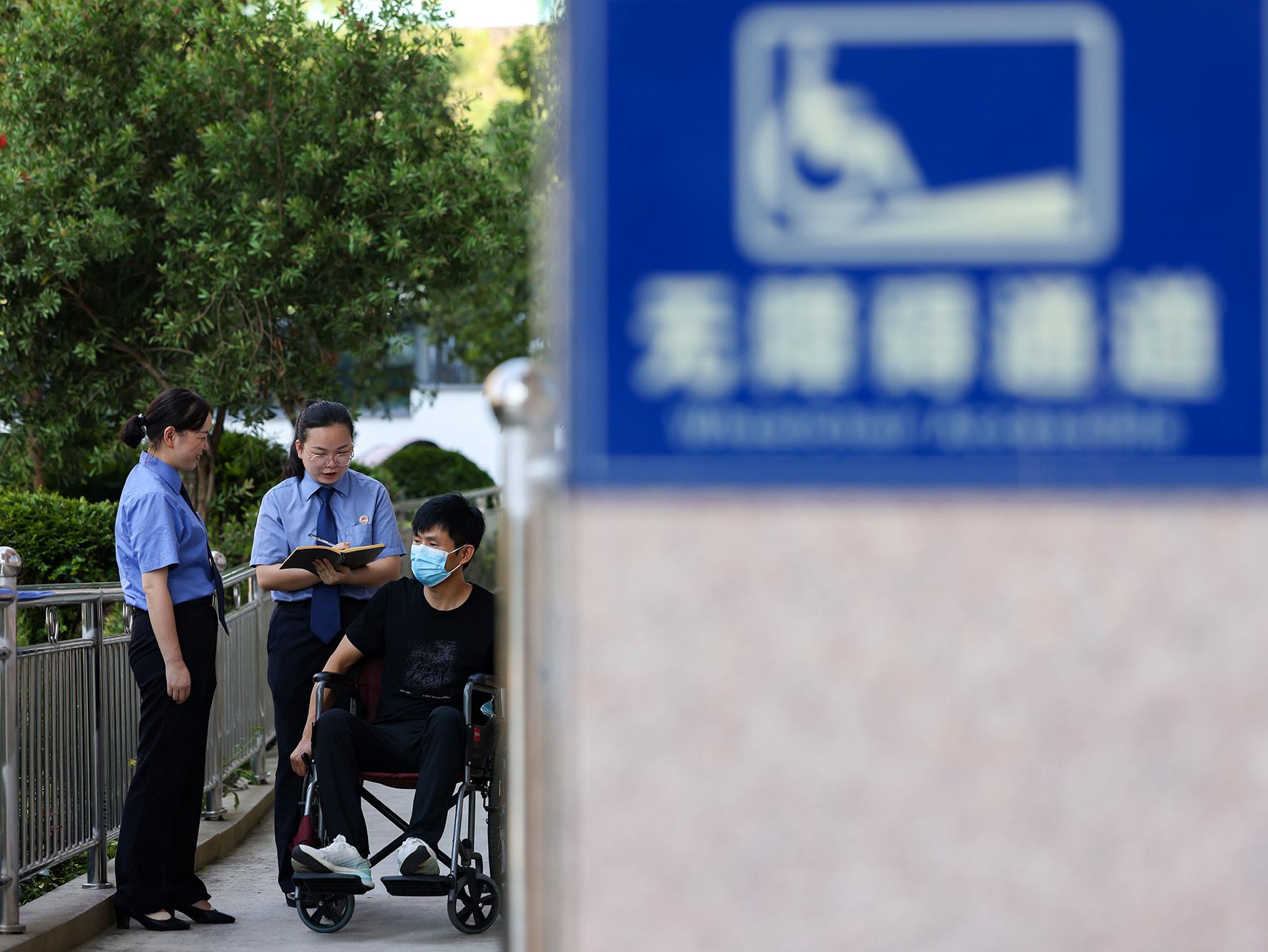 图为7月29日,在贵州省铜仁市玉屏侗族自治县行政服务中心,检察干警向残疾人士了解无障碍通道体验感受。