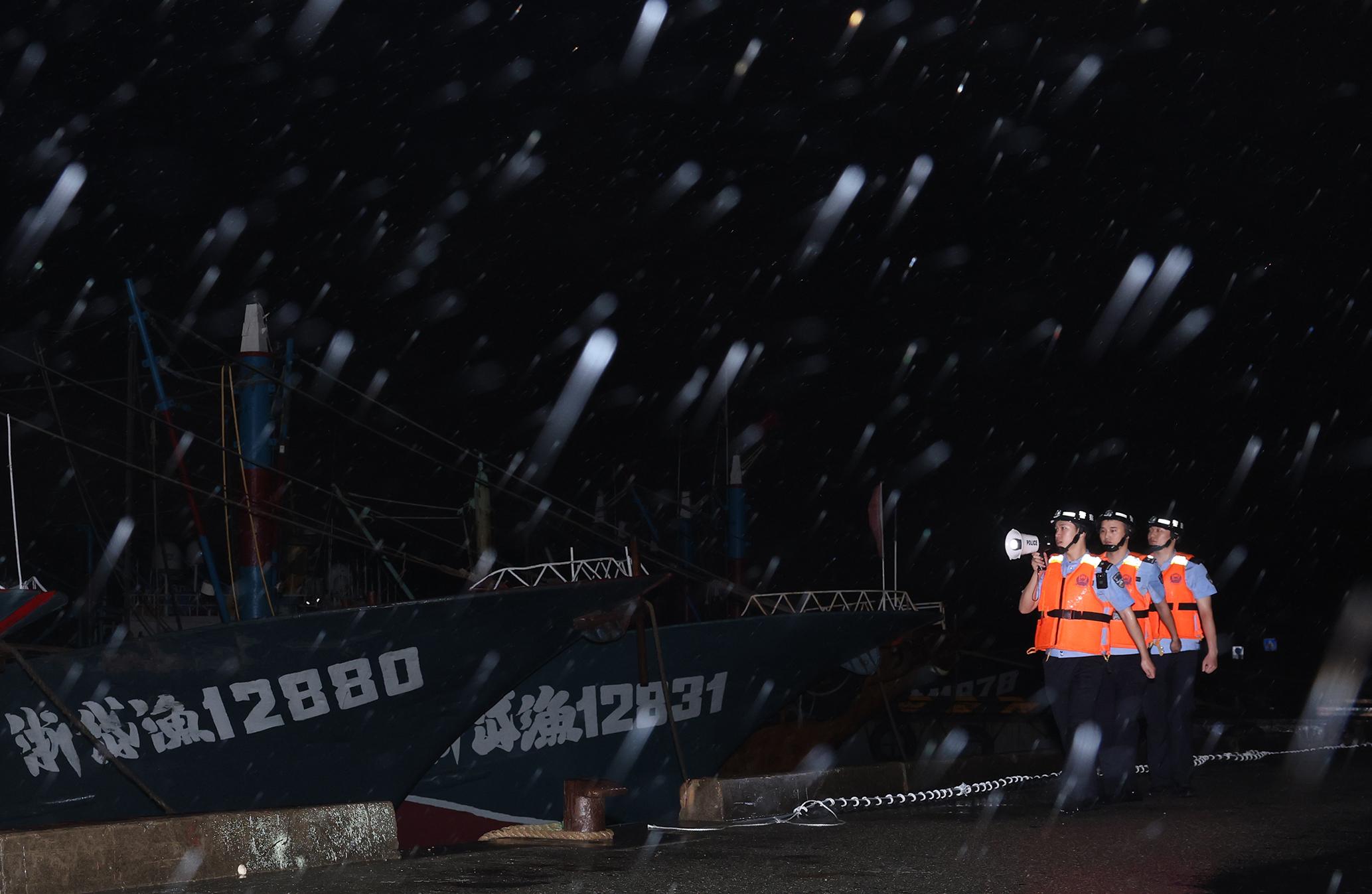 今年第8号台风“竹节草”逼近浙江沿海,7月29日,浙江省岱山县公安局高亭派出所民警进渔村、入码头、上渔船(排),通过高音喇叭、逐船检查等形式排查安全隐患,进一步筑牢防台风“警戒线”。