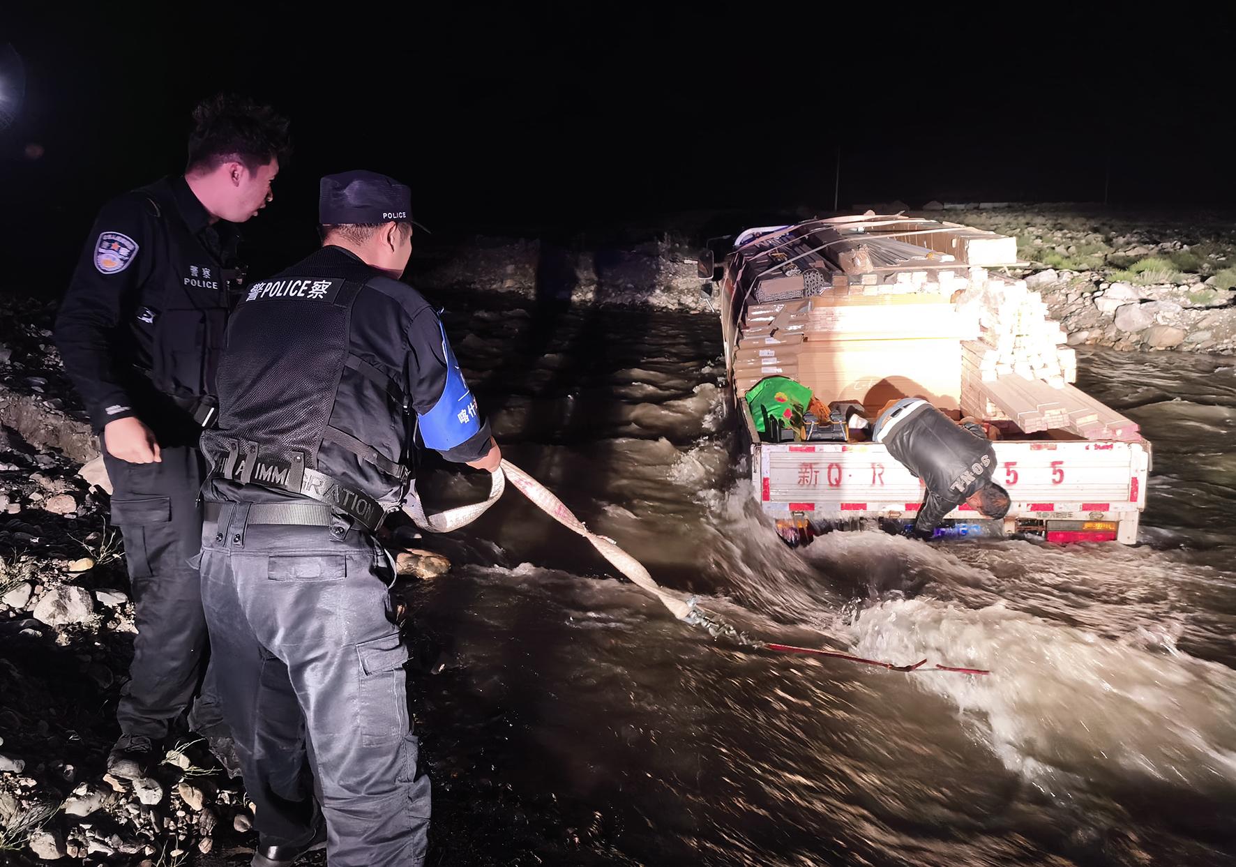 7月30日凌晨1时许,新疆喀什边境管理支队达布达尔边境派出所接群众报警求助称:一辆满载建筑物资的车辆被困河道中央。接警后,达布达尔边境派出所迅速启动应急预案,组织民警携带救援设备前往事发地点展开救援。历时约2小时,将被困车辆转移至安全区域。