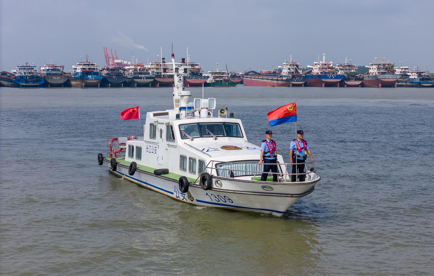 图为民警在长江镇江段荷花池锚地水域开展水上巡逻。