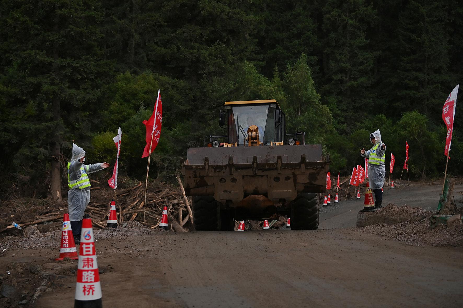 图为8月13日,执勤警力在抢通道路沿线开展工作。