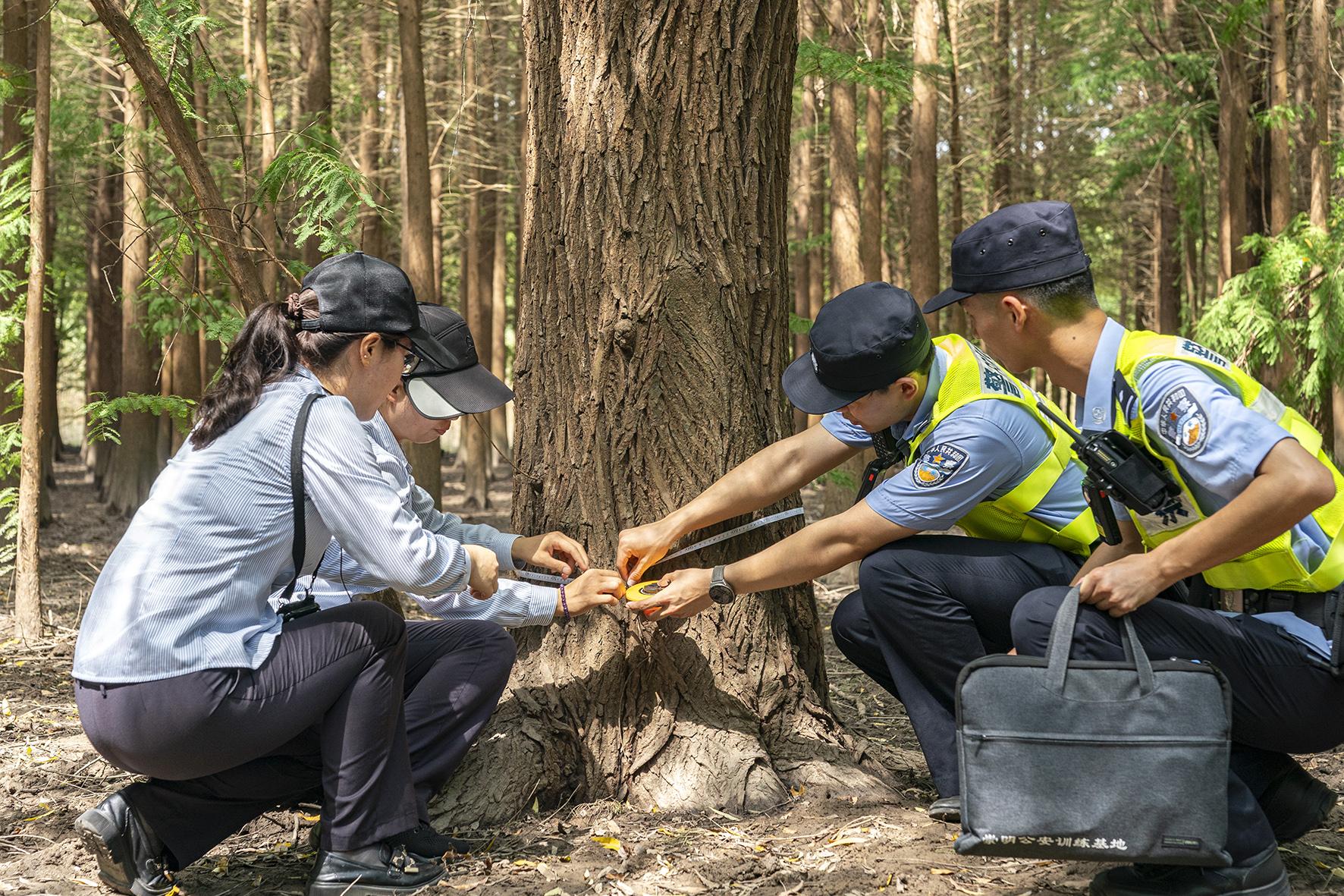 图3、8月14日,民警与工作人员一同查看湿地内树木的生长状态。