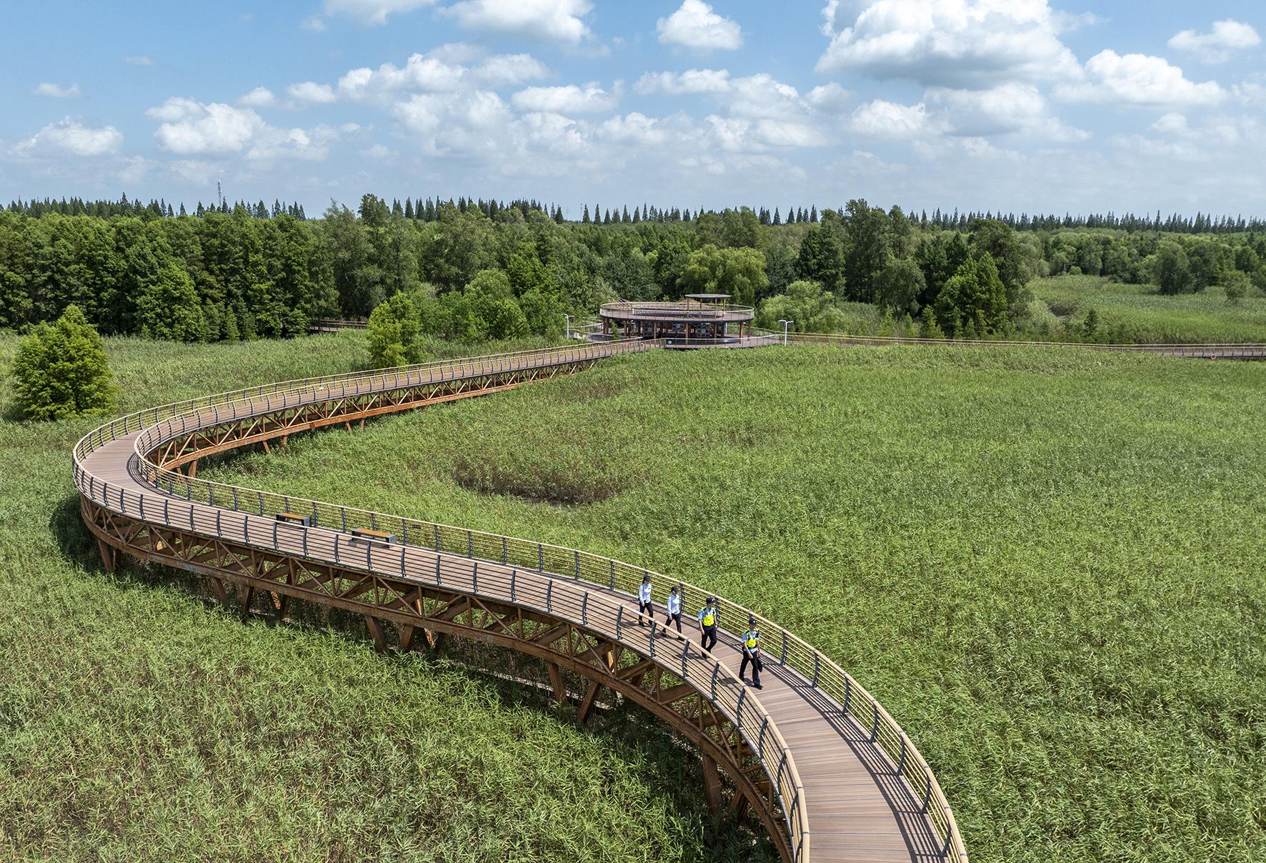 图1、8月14日,民警与工作人员在湿地公园开展常态化巡查。