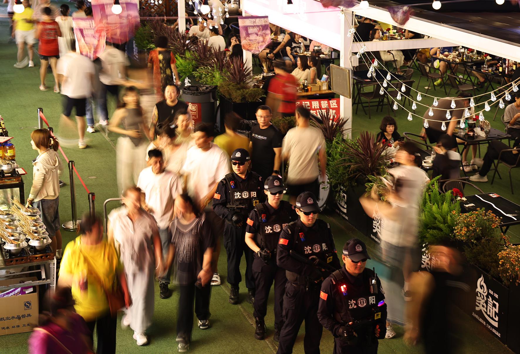 图为8月18日晚,巡特警大队民警在浑河外滩商业网点巡逻。