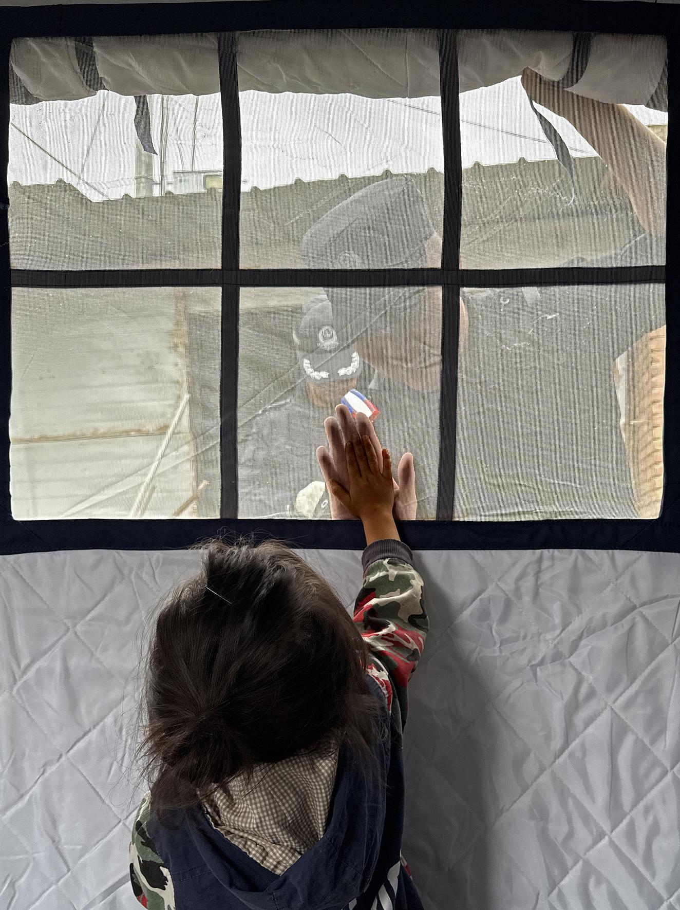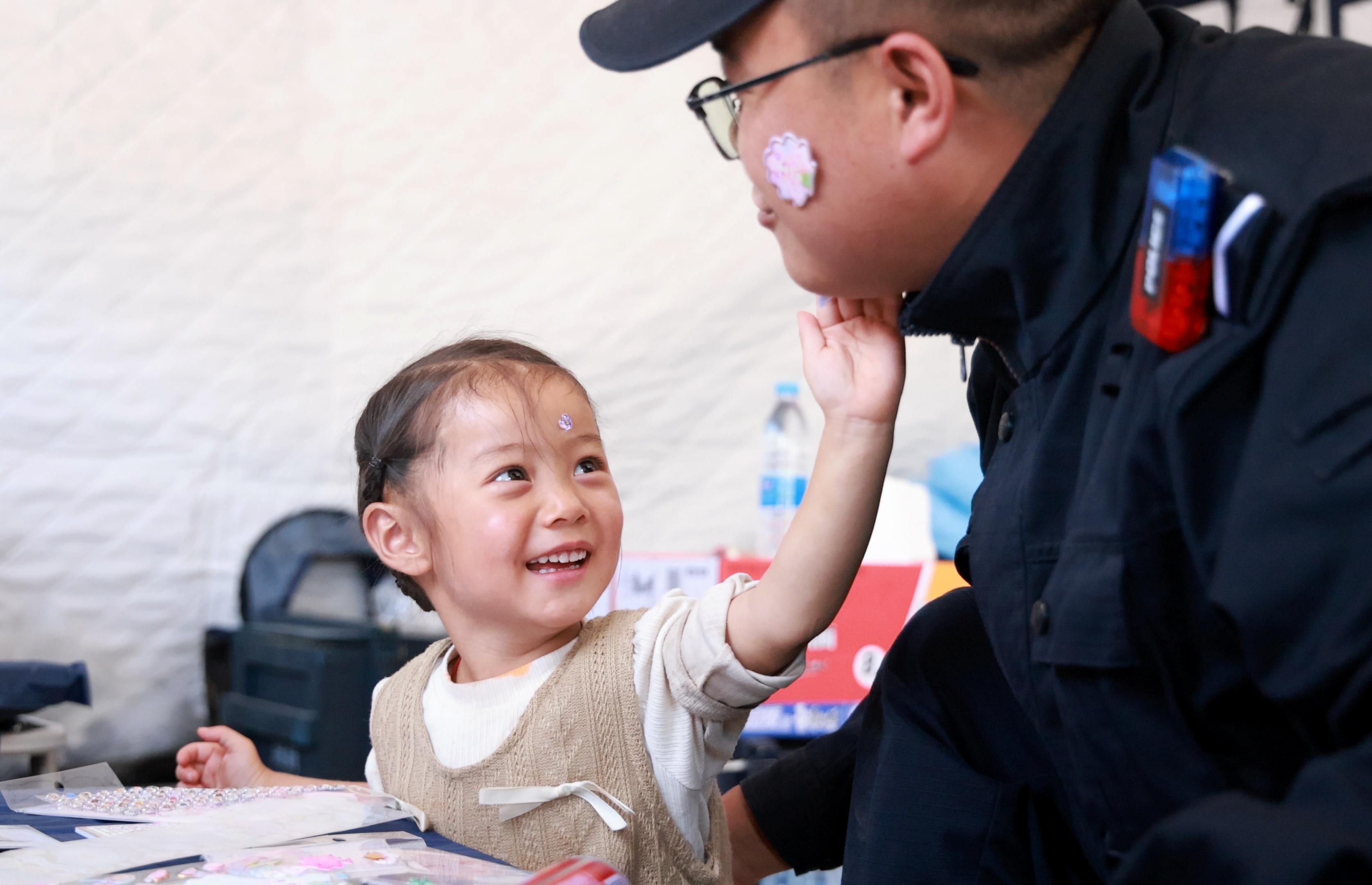 8月14日,瑶瑶在帐篷里给辅警张云峰脸上贴贴纸。金万贵 摄
