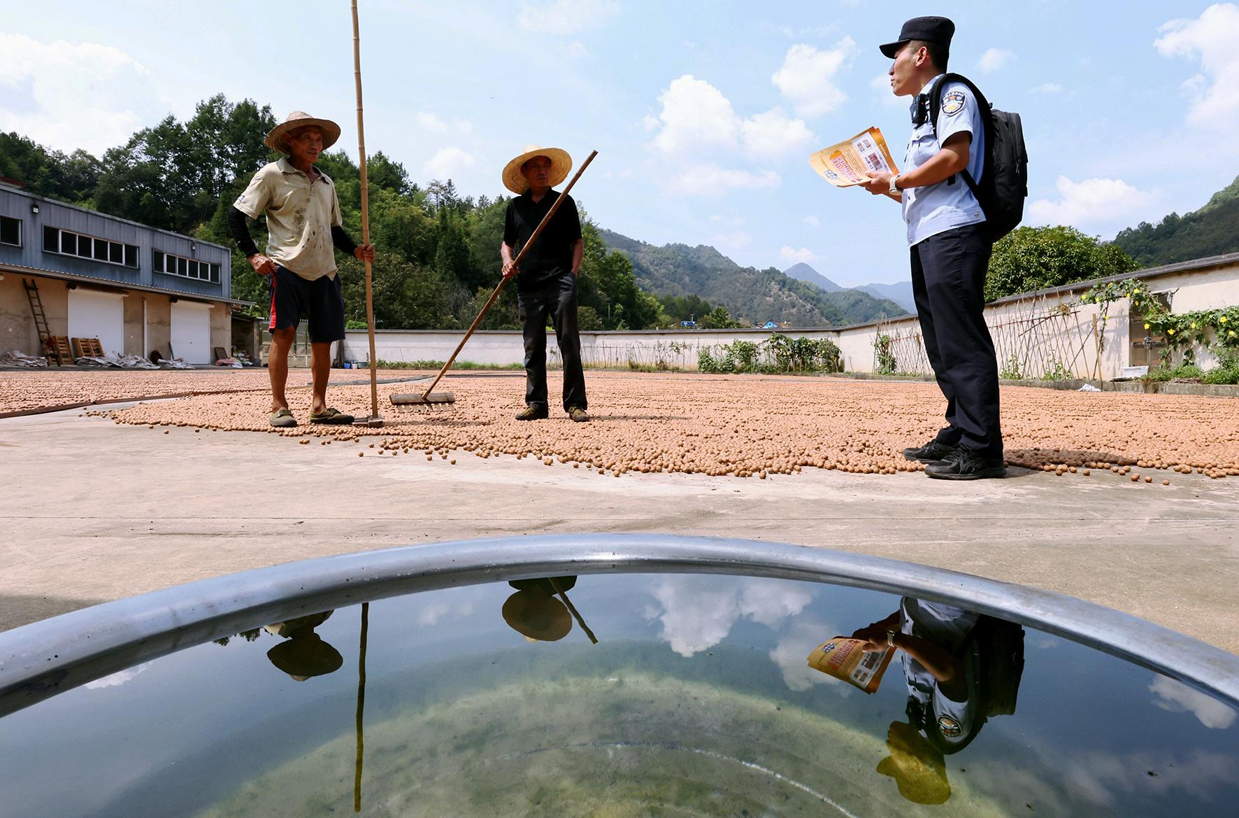 9月4日,安徽省宁国市公安局宁墩派出所联合交管大队中溪中队开展山核桃采摘期间的安全防范宣传活动。