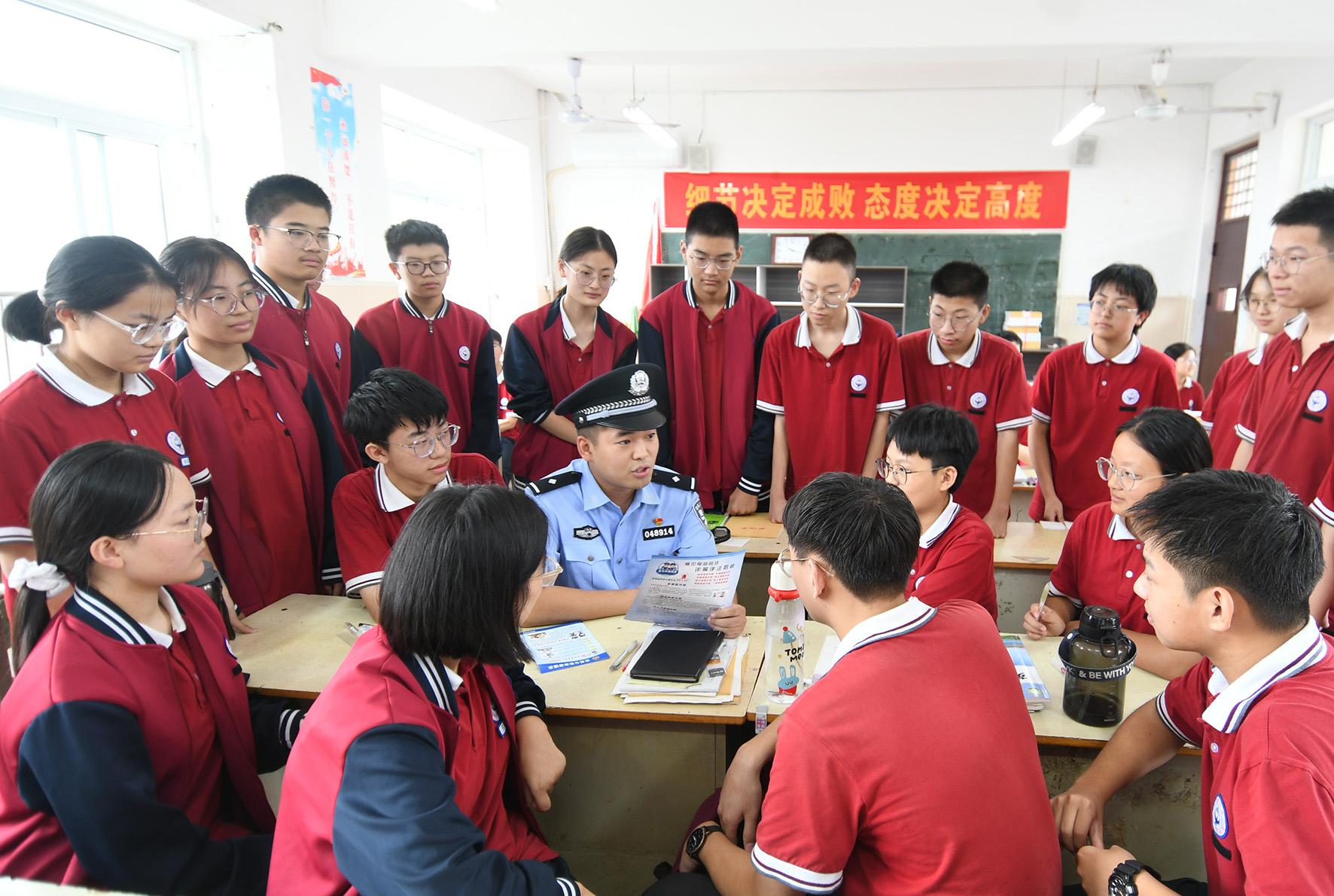 9月5日,河南省浚县公安局伾山派出所民警走进第一高级中学通过开设“平安课堂”,向同学们宣讲安全防范知识。